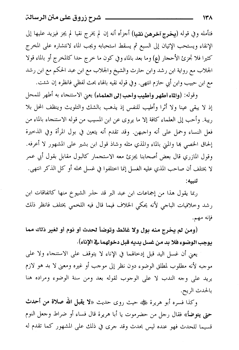 فتأمله وفي قوله (يخرج أخرهن نقياً) أجزأه أنه إن لم يخرج نقياً لم يجز فيزيد عليها إلى الإنقاء ويستحب الإتيان إلى السبع ثم يسقط استحبابه ويجب الماء لانتشاره على المخرج كثيراً فلا تجزئ الأحجار (ع) وما بعد بالماء وفي كون ما خرج حداً كالمخرج أو بالماء قولاً الجلاب مع رواية ابن رشد وابن حارث والشيخ والجلاب مع ابن عبد الحكم مع ابن رشد مع ابن حبيب وابن أبي حازم انتهى. وفي قوله نفيه بالهاء بحث لفظي فانظره إن شئت.