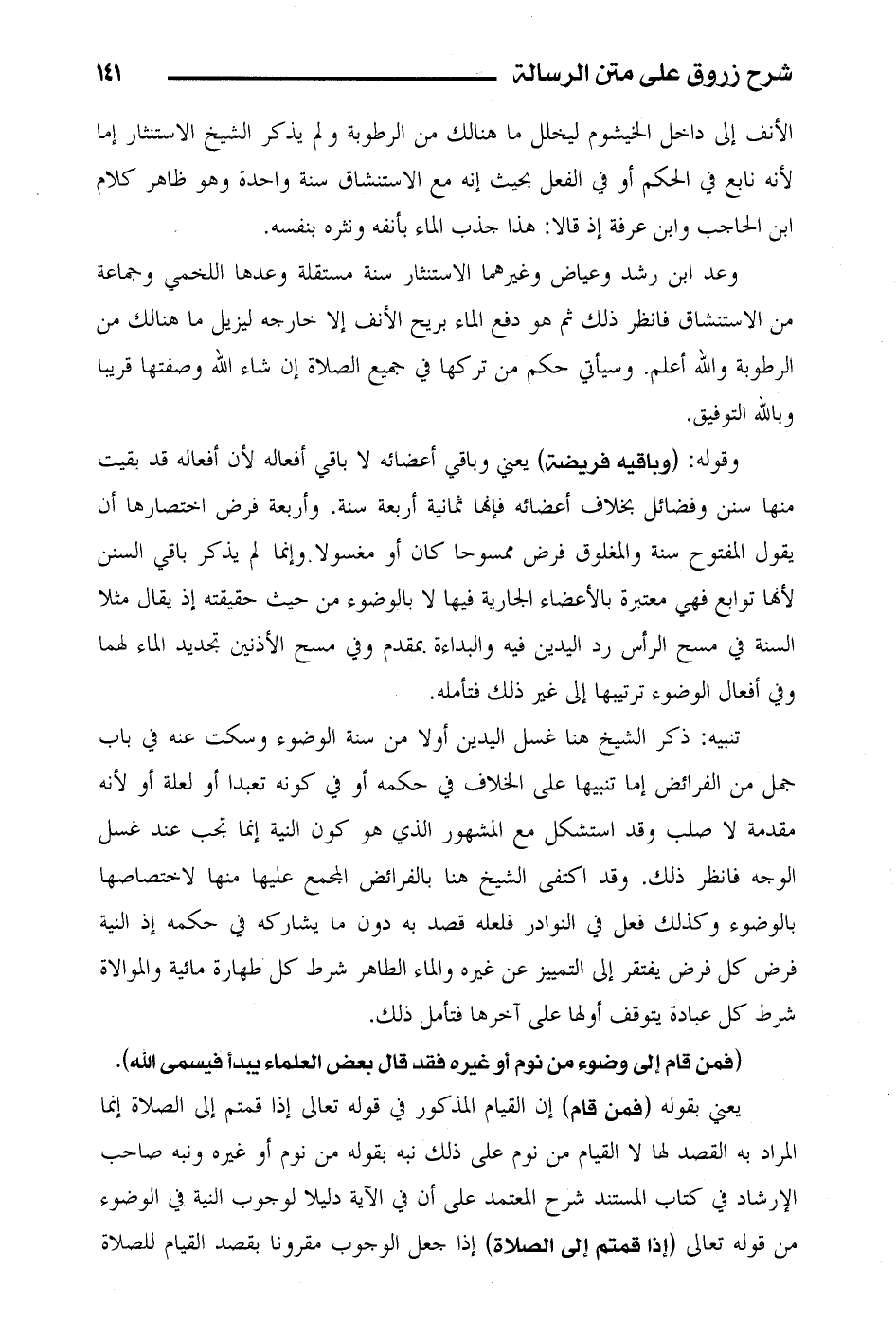 تنبيه: ذكر الشيخ هنا غسل اليدين أولاً من سنة الوضوء وسكت عنه في باب جمل من الفرائض إما تنبيهاً على الخلاف في حكمه أو في كونه تعبداً أو لعلة أو لأنه مقدمة لا صلب وقد استشكل مع المشهور الذي هو كون النية إنما تجب عند غسل الوجه فانظر ذلك. وقد اكتفى الشيخ هنا بالفرائض المجمع عليها منها لاختصاصها بالوضوء وكذلك فعل في النوادر فلعله قصد به ما يشاركه في حكمه إذ النية فرض كل فرض يفتقر إلى التمييز عن غيره والماء الطاهر شرط كل طهارة مائية والموالاة شرط كل عبادة يتوقف أولها على آخرها فتأمل ذلك.