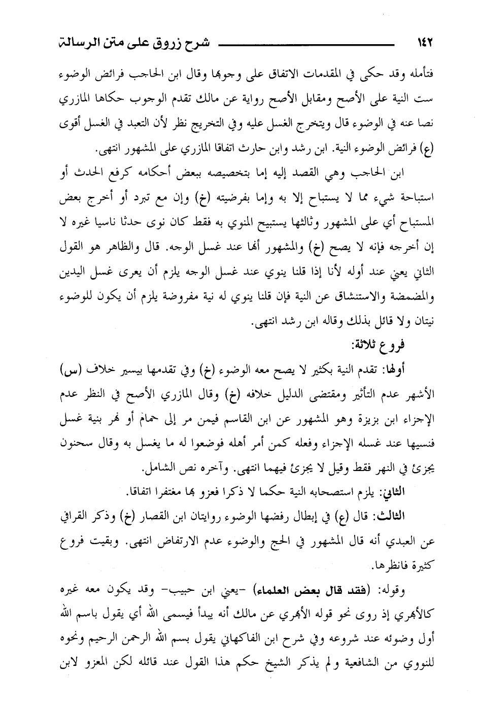 ابن الحاجب وهي القصد إليه إما بتخصيصه ببعض أحكامه كرفع الحارث أو استباحة شيء مما لا يستباح إلا به وإما بفرضيته (خ) وإن مع تبرد أو أخرج بعض المستباح أي على المشهور وثالثها يستبيح المنوي به فقط كان نوى حدثاً ناسياً غيره لا إن أخرجه فإنه لا يصح (خ) والمشهور أنها عند غسل الوجه. قال والظاهر هو القول الثاني يعني عند أوله لأنا إذا قلنا ينوي عند غسل الوجه يلزم أن يعرى غسل اليدين والمضمضة والاستنشاق عن النية فإن قلنا ينوي له نية مفروضة يلزم أن يكون للوضوء نيتان ولا قائل بذلك وقاله ابن رشد انتهى.