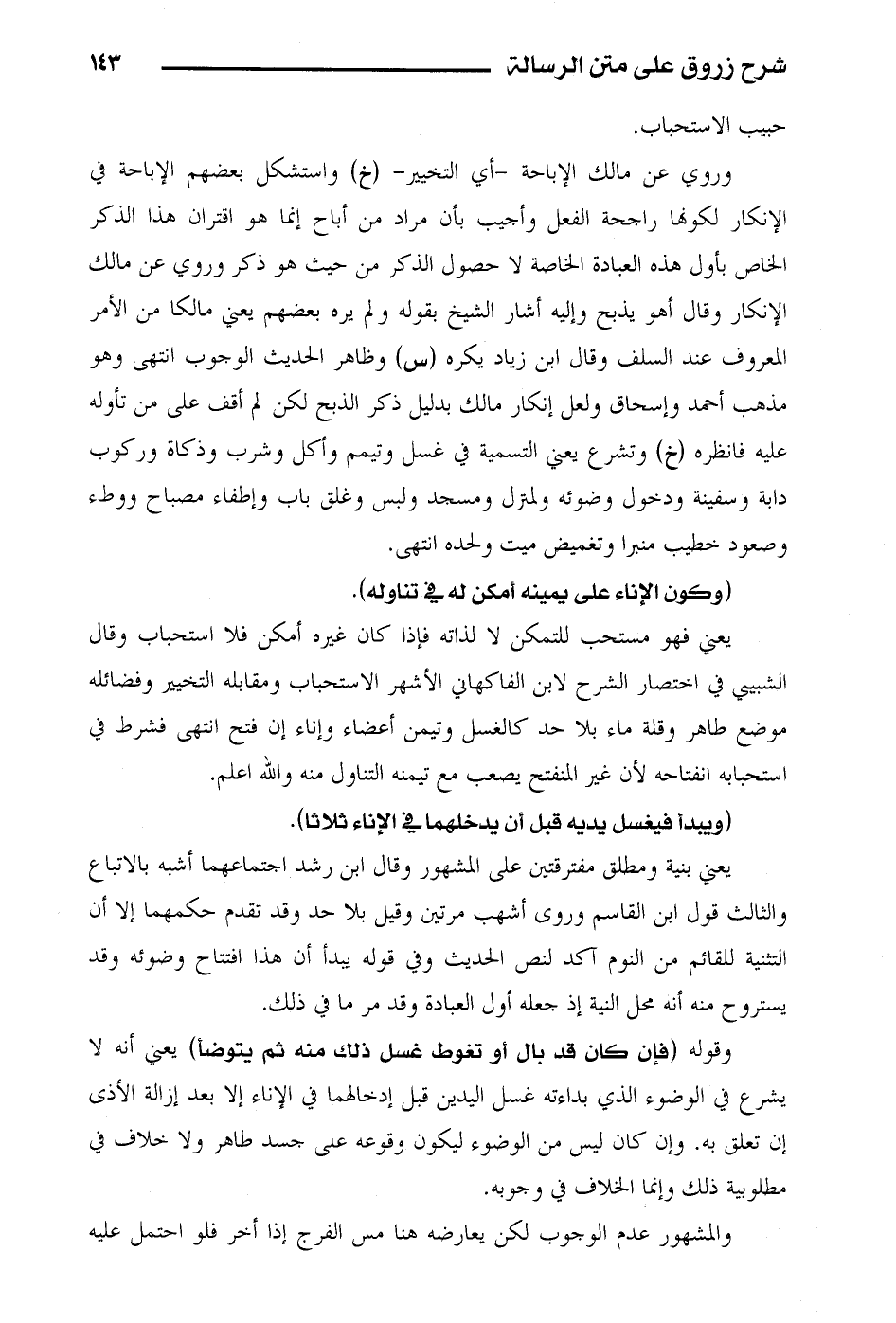وروي عن مالك الإباحة – أي التخيير – (خ) واستشكل بعضهم الإباحة في الإنكار لكونها راجحة الفعل وأجيب بأن مراد من أباح إنما هو اقتران هذا الذكر الخاص بأول هذه العبادة الخاصة لا حصول الذكر من حيث هو ذكر وروي عن مالك الإنكار وقال أهو يذبح وإليه أشار الشيخ بقوله ولم يره بعضهم يعني مالكاً من الأمر المعروف عند السلف وقال ابن زياد يكره (س) وظاهر الحديث الوجوب انتهى وهو مذهب أحمد وإسحاق ولعل إنكار مالك بدليل ذكر الذبح لكن لم أقف على من تأوله عليه فانظره (خ) وتشرع يعني التسمية في غسل وتيمم وأكل وشرب وزكاة وركوب دابة وسفينة ودخول وضوئه ولمنزل ومسجد ولبس وغلق باب وإطفاء مصباح ووطء وصعود خطيب منبراً وتغميض ميت ولحده انتهى.