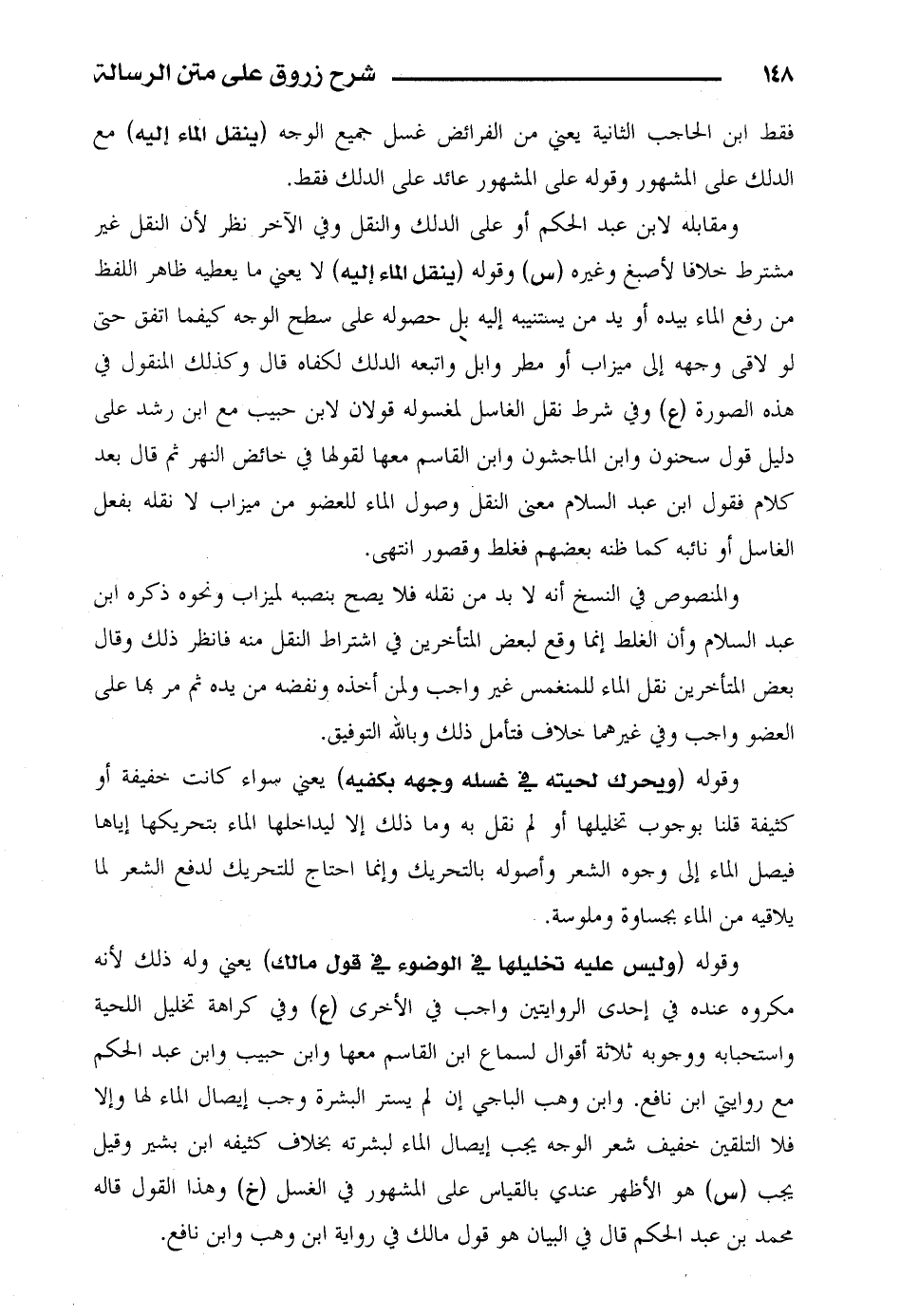 ومقابله لابن عبد الحكم أو على الدلك والنقل وفي الآخر نظر لأن النقل غير مشترك خلافاً لأصبغ وغيره (س) وقوله (ينقل الماء إليه) لا يعني ما يعطيه ظاهر اللفظ من رفع الماء بيده أو يد من يستنيبه إليه بل حصوله على سطح الوجه كيفما اتفق حتى لو لاقى وجهه إلى ميزاب أو مطر وابل واتبعه الدلك لكفاه قال وكذلك المنقول في هذه الصورة (ع) وفي شرط نقل الغاسل لمغسوله وقولان لابن حبيب مع ابن رشد على دليل قول سحنون وابن الماجشون وابن القاسم معها لقولها في خائض النهر ثم قال بعد كلام فقول ابن عبد السلام معنى النقل وصول الماء للعضو من ميزاب لا نقله بفعل الغاسل أو نائبه كما ظنه بعضهم فغلط وقصور انتهى.