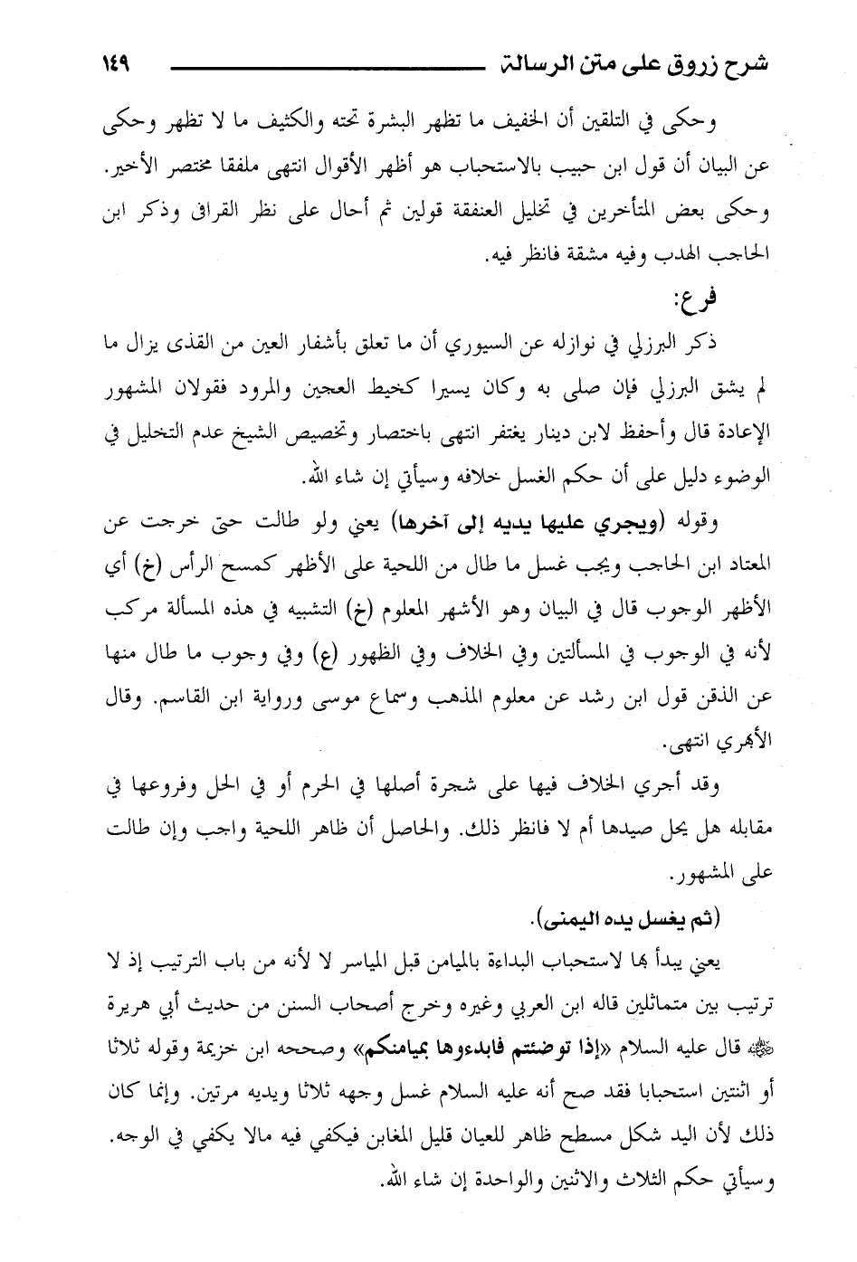وحكى بعض المتأخرين في تخليل العنفقة قولين ثم أحال على نظر القرافي وذكر ابن الحاجب الهدب وفيه مشقة فانظر فيه.