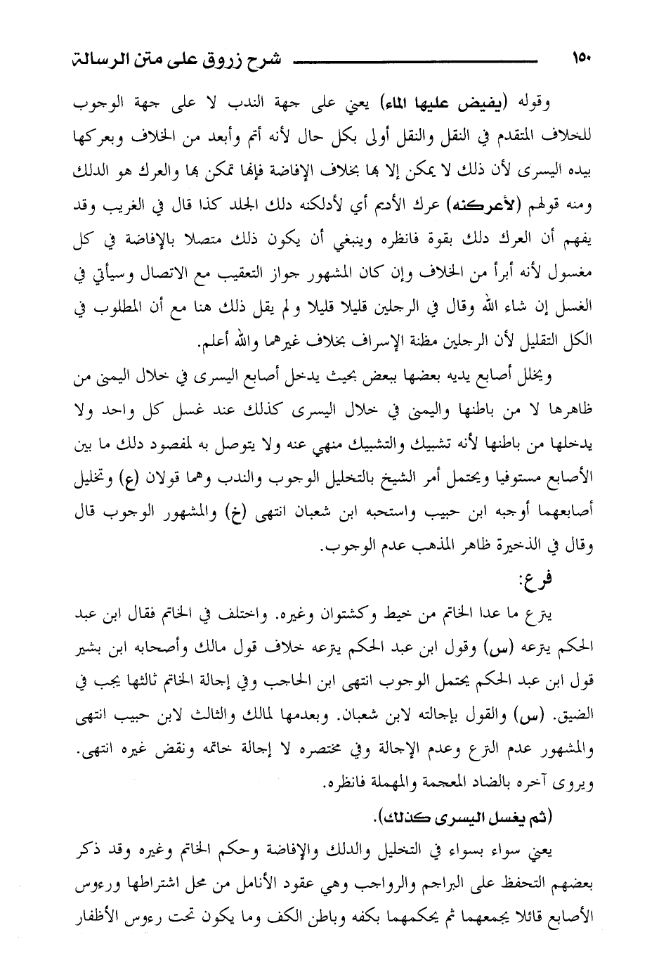 ينزع ما عدا الخاتم من خيط وكشتوان وغيره. واختلف في الخاتم فقال ابن عبد الحكم بنزعه (س) وقول ابن عبد الحكم ينزعه خلاف قول مالك وأصحابه ابن بشير قول ابن عبد الحكم يحتمل الوجوب انتهى ابن الحاجب وفي إجالة الخاتم ثالثها يجب في الضيق. (س) والقول بإجالته لابن شعبان. وبعدمها لمالك والثالث لابن حبيب انتهى والمشهور عدم النزع وعدم الإجالة وفي مختصره لا إجالة خاتمه ونقض غيره انتهى.