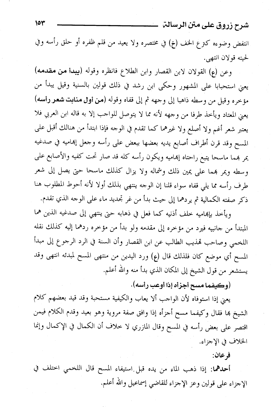 وعن (ع) القولان لابن القصار وابن الطلاع فانظره وقوله (يبدأ من مقدمه) يعني استحباباً على المشهور وحكى ابن رشد في ذلك قولين بالسنية وقيل يبدأ من مؤخره وقيل من وسطه ذاهباً إلى وجهه ثم إلى قفاه وقوله (من أول منابت شعر رأسه) يعني المعتاد ويأخذ طرفا من وجهه لأنه مما لا يتوصل للواجب إلا به قاله ابن العربي فلا يعتبر شعر أغم ولا أصلع ولا غيرهما كما تقدم في الوجه فإذا ابتدأ من هنالك أقبل على المسح وقد قرن أطراف أصابع يديه بعضها ببعض على رأسه وجعل إبهاميه في صدغيه يمر بهما ماسحا يتبع راحتاه إبهاميه ويكون رأسه كله قد صار تحت كفيه والأصابع على وسطه ويمر بهما على يمين ذلك وشماله ولا يزال كذلك ماسحا حتى يصل إلى شعر طرف رأسه مما يلي قفاه سواء قلنا إن الوجه ينتهي بذلك أولا لأنه أحوط المطلوب هنا ذكر صفته الكمالية ثم يردهما إلى حيث بدأ من غر تجديد ماء على الوجه الذي تقدم.