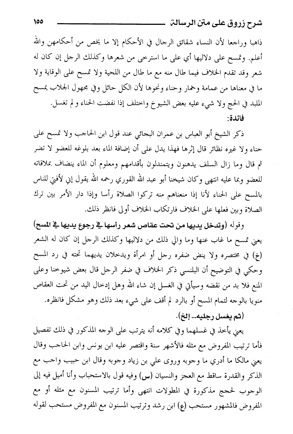 ذكر الشيخ أبو العباس بن عمران البجائي عند قول ابن الحاجب ولا تمسح على حناء ولا غيره نظائر قال إثرها فهذا يدل على أن إضافة الماء بعد بلوغه للعضو لا تضر ثم قال وما زال السلف يدهنون ويتمندلون بأقدامهم ومعلوم أن الماء ينضاف بملاقاته للعضو وبما عليه انتهى وكان شيخنا أبو عبد الله القوري رحمه الله يقول إني لأفتي للناس بالمسح على الحناء لأنا إذا منعناهم منه تركوا الصلاة رأساً وإذا دار الأمر بين ترك الصلاة وبين فعلها على الخلاف فارتكاب الخلاف أولى فانظر ذلك.