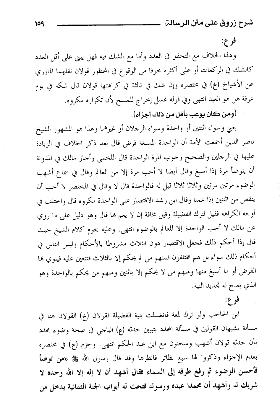 ابن الحاجب ولو ترك لمعة فانغسلت بنية الفضيلة فقولان (خ) القولان هنا في مسألة يشبهان القولين في مسألة المجدد بتبيين حدثه (ع) الباجي في صحة وضوء مجدد بأن حدثه قولان أشهب وسحنون مع ابن عبد الحكم انتهى. وجزم (خ) في مختصره بعدم الإجزاء وذكروا لها سبع نظائر فانظرها وقد قال رسول الله صلى الله عليه وسلم «من توضأ فأحسن الوضوء ثم رفع طرفه إلى السماء فقال أشهد أن لا إله إلا الله وحده لا شريك له وأشهد أن محمداً عبده ورسوله فتحت له أبواب الجنة الثمانية يدخل من