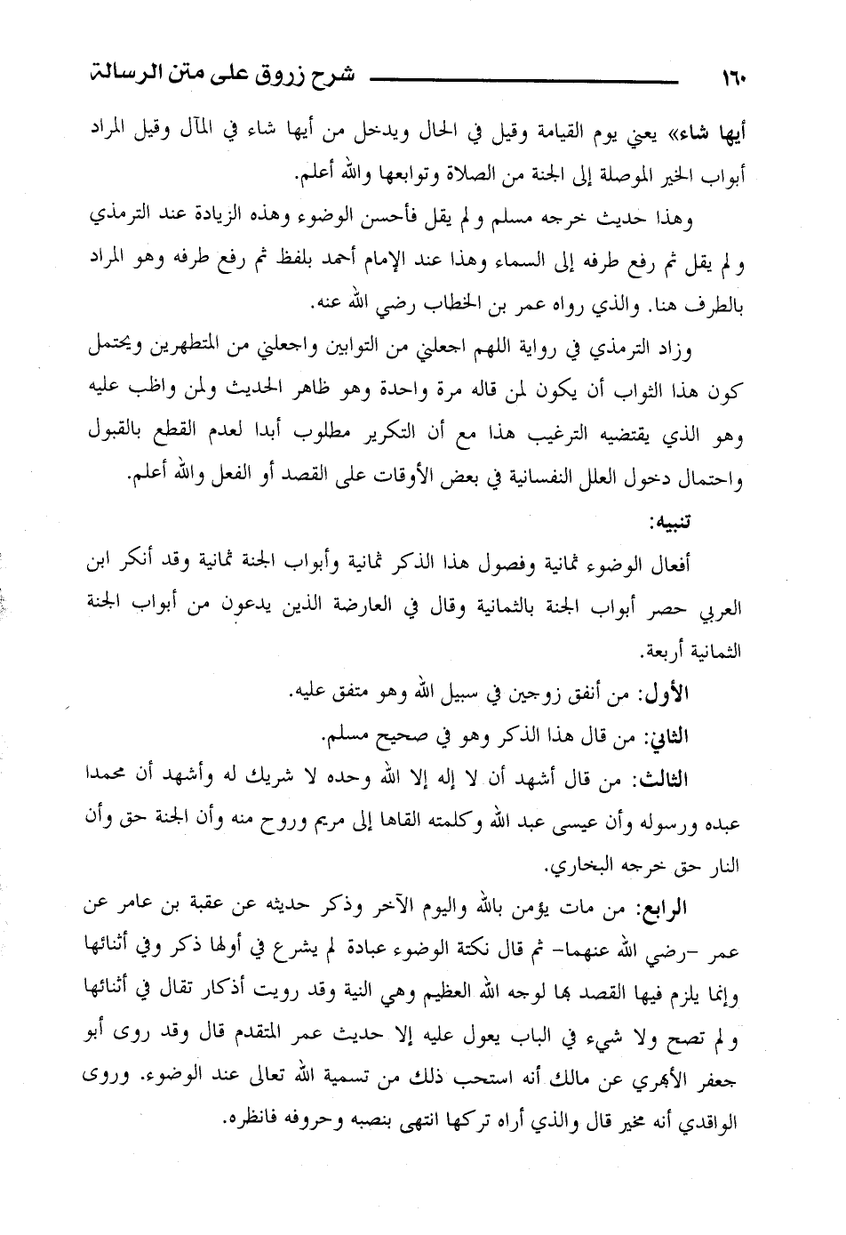 الرابع: من مات يؤمن بالله واليوم الآخر وذكر حديثه عن عقبة بن عامر عن عمر - رضي الله عنهما – ثم قال نكتة الوضوء عبادة لم يشرع في أولها ذكر وفي أثنائها وإنما يلزم فيها القصد بها لوجه الله العظيم وهي النية وقد رويت أذكار تقال في أثنائها ولم تصح ولا شيء في الباب يعول عليه إلا حديث عمر المتقدم قال وقد روى أبو جعفر الأبهري عن مالك أنه استحب ذلك من تسمية الله تعالى عند الوضوء. وروى الواقدي أنه مخير قال والذي أراه تركها انتهى بنصبه وحروفه فانظره.