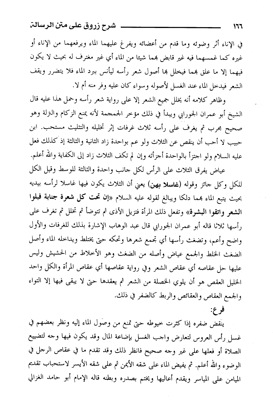 وظاهر كلامه أنه يخلل جميع الشعر إلا على رواية شعر رأسه وحمل هذا عليه قال الشيخ أبو عمران الجورابي ويبدأ في ذلك مؤخر الجمجمة لأنه يمنع الزكاة والنزلة وهو صحيح مجرب ثم يغرف على رأسه ثلاث غرفات إثر تخليله والتثليث مستحب. ابن حبيب لا أحب أن ينقص عن الثلاث ولو عم بواحدة زاد الثانية والثالثة إذ كذلك فعل عليه السلام ولو اجتزأ بالواحدة أجزأته وإن لم تكف الثلاث زاد إلى الكفاية والله أعلم.