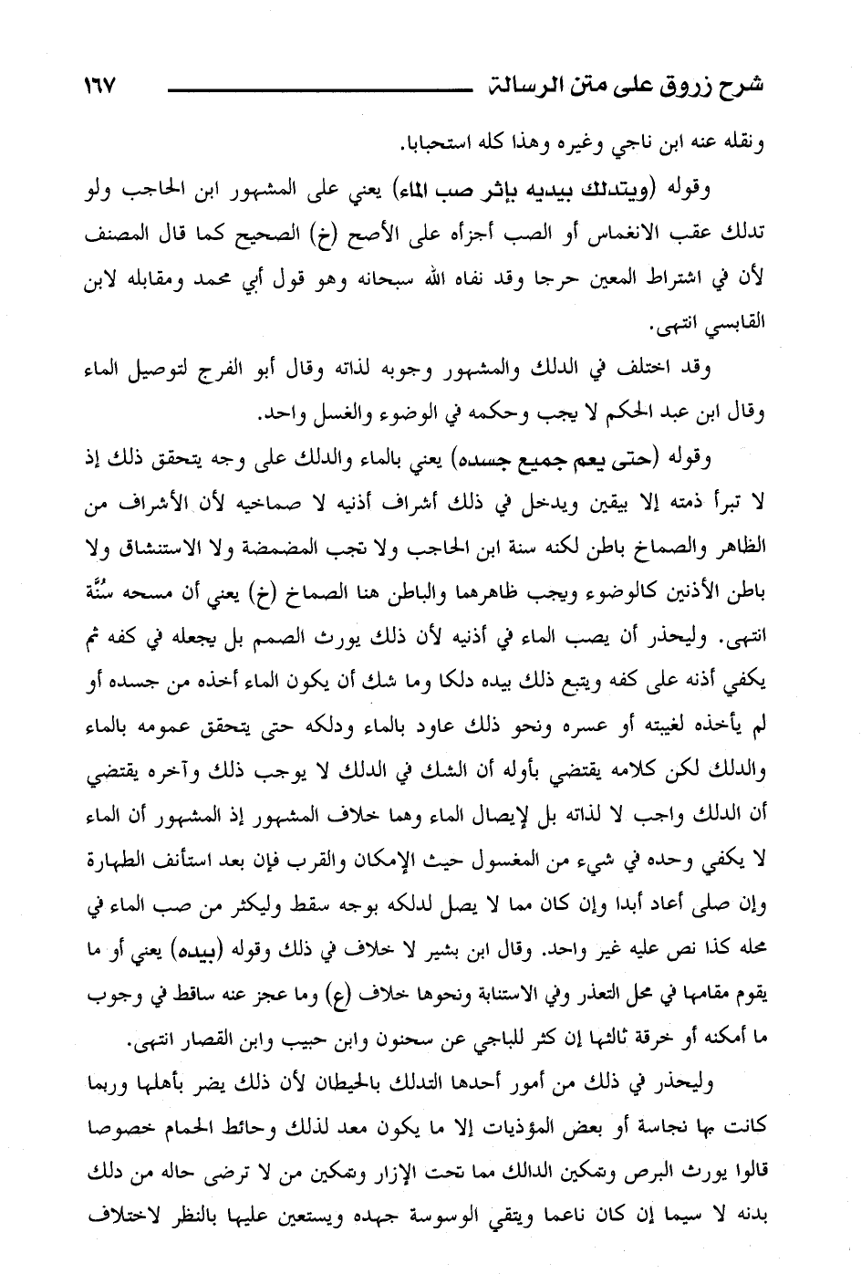 قوله (حتى يعم جميع جسده) يعني بالماء والدلك على وجه يتحقق ذلك إذ لا تبرأ ذمته إلا بيقين ويدخل في ذلك أشراف أذنيه لا صماخيه لأن الأشراف من الظاهر والصماخ باطن لكنه سنة ابن الحاجب ولا تجب المضمضة ولا الاستنشاق ولا باطن الأذنين كالوضوء ويجب ظاهرهما والباطن هنا الصماخ (خ) يعني أن مسحه سنة انتهى. وليحذر أن يصب الماء في أذنيه لأن ذلك يورث الصمم بل يجعله في كفه ثم يكفي أذنه على كفه ويتبع ذلك بيده دلكاً وما شك أن يكون الماء أخذه من جسده أو لم يأخذه لغيبته أو عسره ونحو ذلك عاود بالماء ودلكه حتى يتحقق عمومه بالماء والدلك لكن كلامه يقتضي بأوله أن الشك في الدلك لا يوجب ذلك وآخره يقتضي أن الدلك واجب لا لذاته بل لإيصال الماء وهما خلاف المشهور إذ المشهور أن الماء لا يكفي وحده في شيء من المسغول حيث الإمكان والقرب فإن بعد استأنف الطهارة وإن صلى أعاد أبدا وإن كان مما لا يصل لدلكه بوجه سقط وليكثر من صب الماء في محله كذا نص عليه غير واحد. وقال ابن بشير لا خلاف في ذلك وقوله (بيده) يعني أو ما يقوم مقامها في ملح التعذر وفي الاستنابة ونحوها خلاف (ع) وما عجز عنه ساقط في وجوب ما أمكنه أو خرقه ثالثها إن كثر للباجي عن سحنون وابن حبيب وابن القصار انتهى.