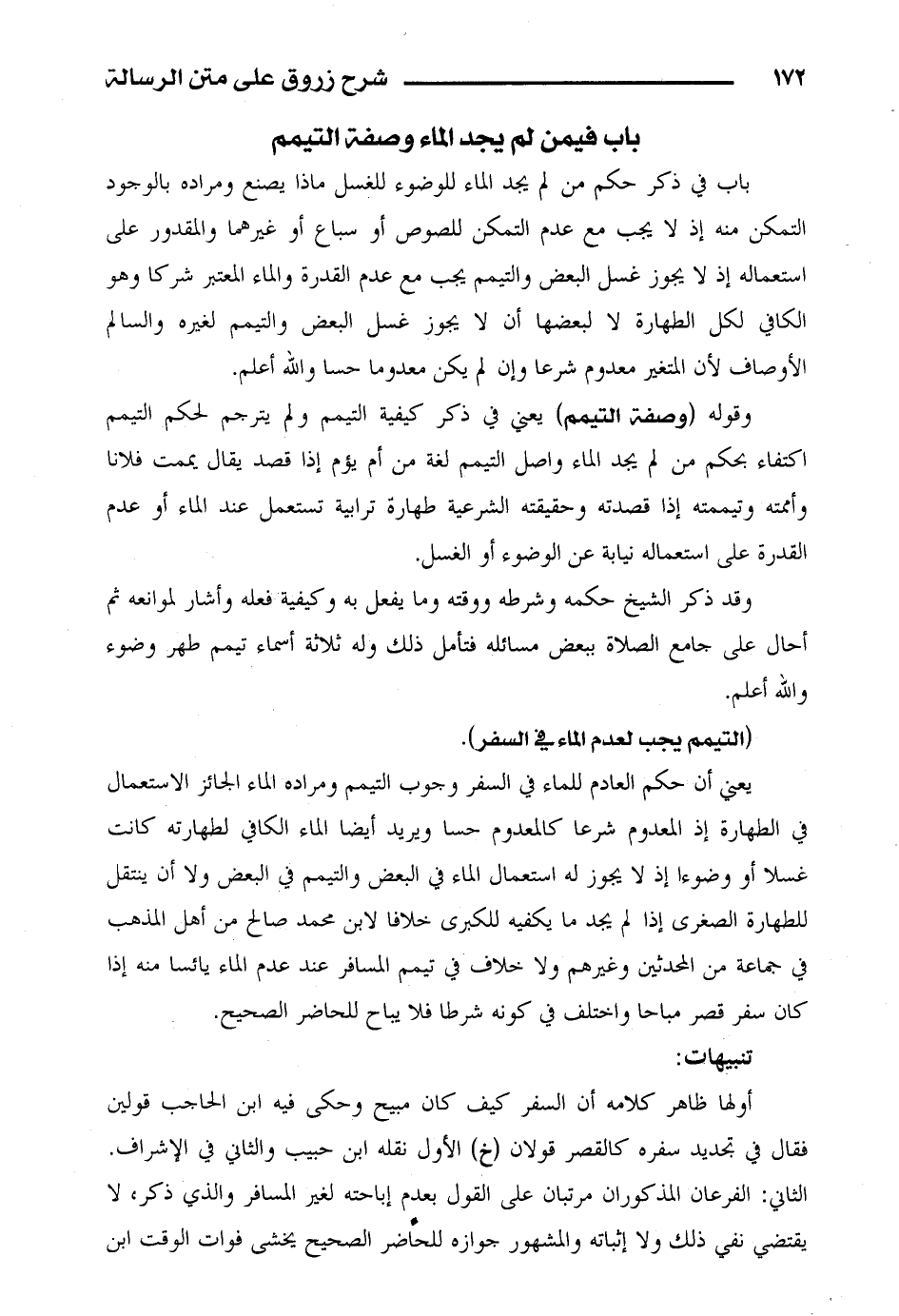 باب في ذكر حكم من لم يجد الماء للوضوء للغسل ماذا يصنع ومراده بالوجود التمكن منه إذ لا يجب مع عدم التمكن للصوص أو سباع أو غيرهما والمقدور على استعماله إذ لا يجوز غسل البعض والتيمم يجب مع عدم القدرة والماء المعتبر شركاً وهو الكافي لكل الطهارة لا لبعضها أن لا يجوز غسل البعض والتيمم لغيره والسالم الأوصاف لأم المتغير معدوم شرعاً وإن لم يكن معدوما حسا والله أعلم.