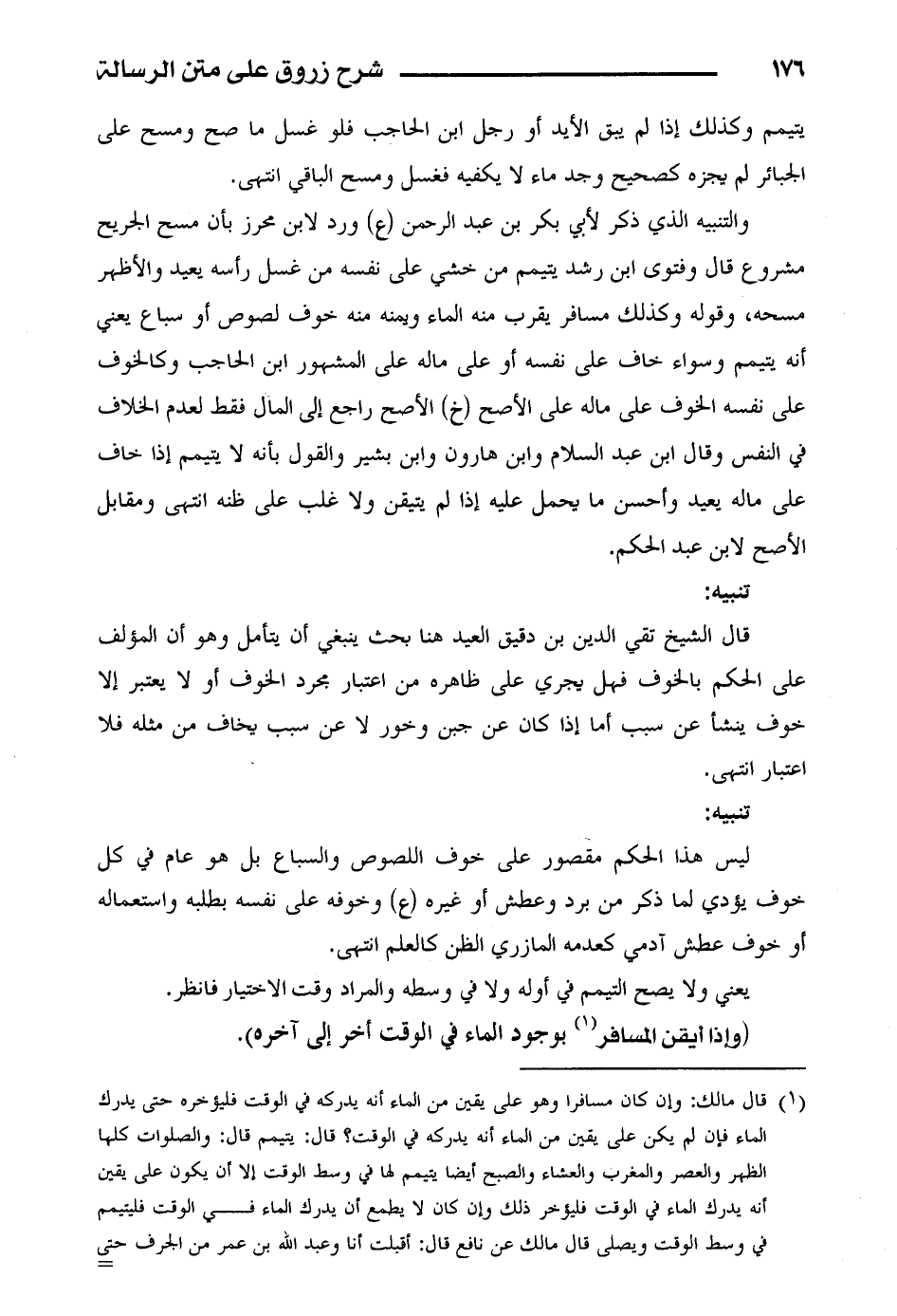 والتنبيه الذي ذكر لأبي بكر بن عبد الرحمن (ع) ورد لابن محرز بأن مسح الجريح مشروع قال وفتوى ابن رشد يتيمم من خشي على نفسه من غسل رأسه يعيد والأظهر مسحه، وقوله وكذلك مسافر يقرب منه الماء ويمنه منه خوف لصوص أو سباع يعني أنه يتيمم وسواء خاف على نفسه أو على ماله على المشهور ابن الحاجب وكالخوف على نفسه الخوف على ماله على الأصح (خ) الأصح راجع إلى المال فقط لعدم الخلاف في النفس وقال ابن عبد السلام وابن هارون وابن بشير والقول بأنه لا يتيمم إذا خاف على ماله يعيد وأحسن ما يحمل عليه إذا لم يتيقن ولا غلب على ظنه انتهى ومقابل الأصح لابن عبد الحكم.