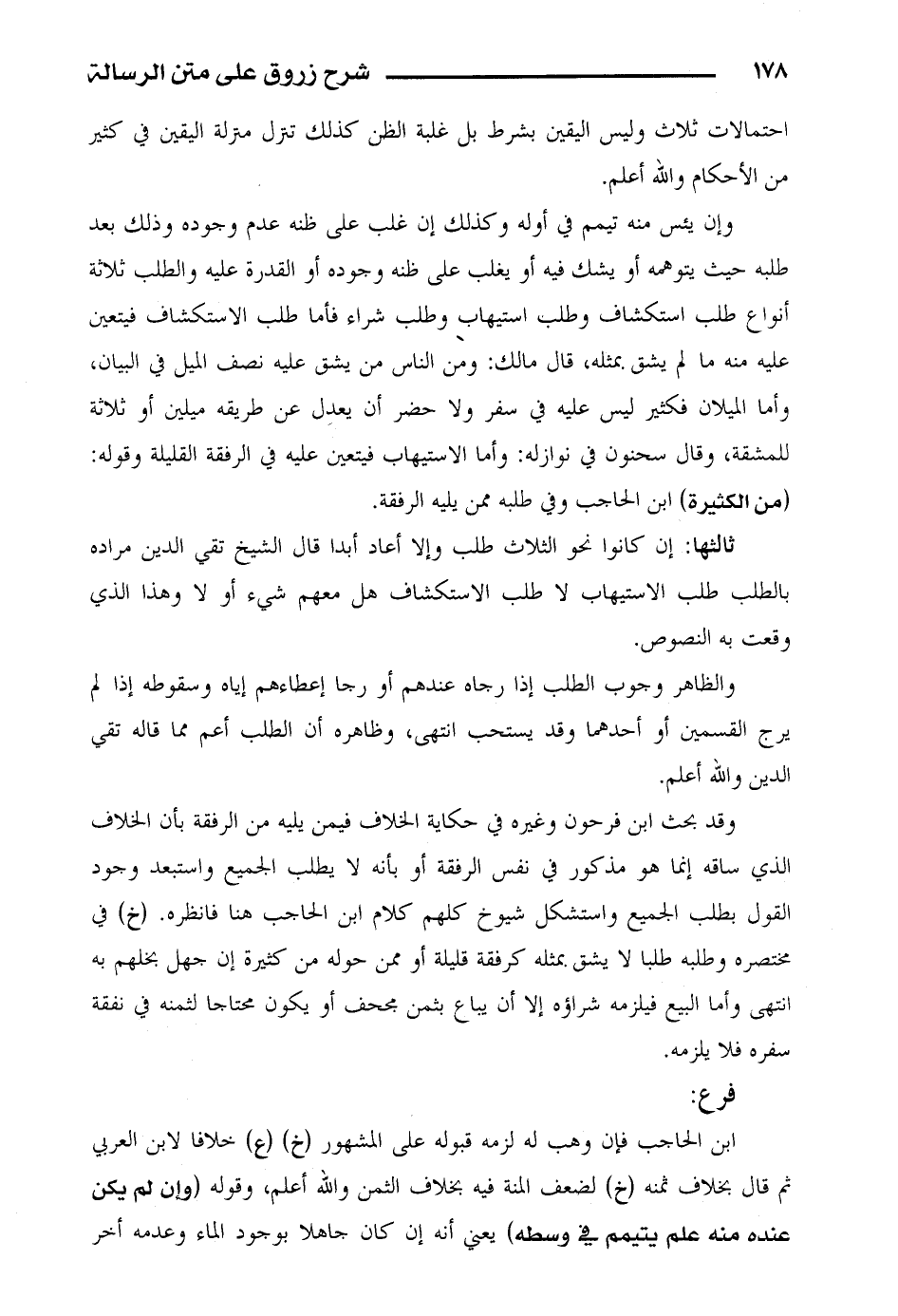 وقد بحث ابن فرحون وغيره في حكاية الخلاف فيمن يليه من الرفقة بأن الخلاف الذي ساقه إنما هو مذكور في نفس الرفقة أو بأنه لا يطلب الجميع واستبعد وجود القول بطلب الجميع واستشكل شيوخ كلهم كلام ابن الحاجب هنا فانظره. (خ) في مختصره وطلبه طلبا لا يشق بمثله كرفقة قليلة أو ممن حوله من كثيرة إن جهل بخلهم به انتهى وأما البيع فيلزمه شراؤه إلا أن يباع بثمن مجحف أو يكون محتاجاً لثمنه في نفقة سفره فلا يلزمه.