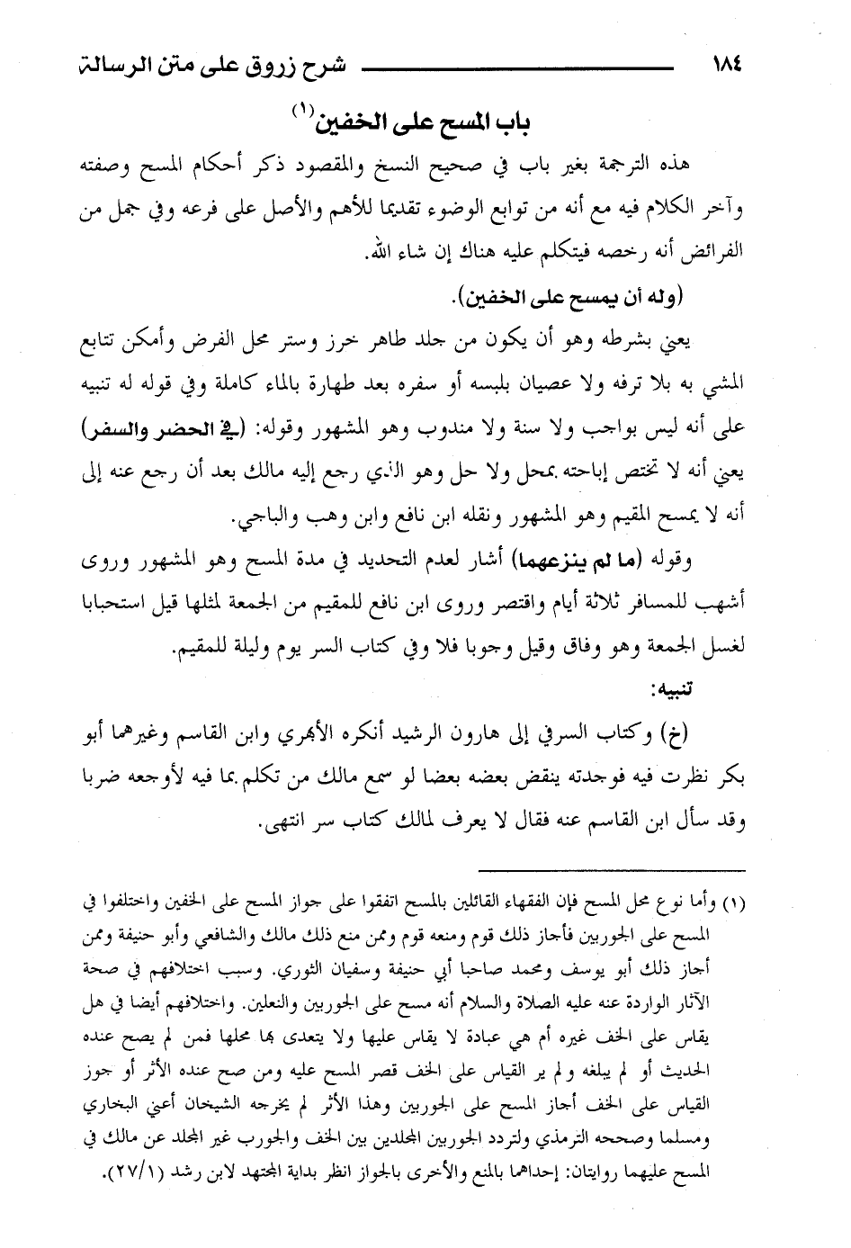 هذه الترجمة بغير باب في صحيح النسخ والمقصود ذكر أحكام المسح وصفته وآخر الكلام فيه مع أنه من توابع الوضوء تقديما للأهم والأصل على فرعه وفي جمل من الفرائض أنه رخصة فيتكلم عليه هناك إن شاء الله.