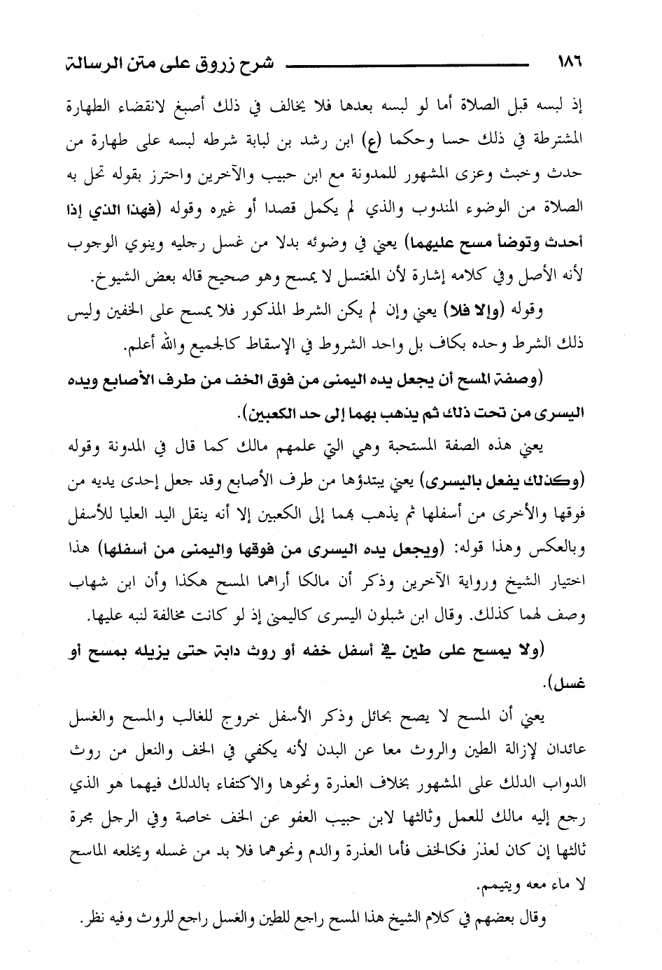 إذ لبسه قبل الصلاة أما لو لبسه بعدها فلا يخالف في ذلك أصبغ لانقضاء الطهارة المشترطة في ذلك حسا وحكما (ع) ابن رشد بن لبابة شرطه لبسه على طهارة من حدث وخبث وعزى المشهور للمدونة مع ابن حبيب والآخرين واحترز بقوله تحل به الصلاة من الوضوء المندوب والذي لم يكمل قصداً أو غيره وقوله (فهذا الذي إذا أحدث وتوضأ مسح عليهما) يعني في وضوئه بدلاً من غسل رجليه وينوي الوجوب لأنه الأصل وفي كلامه إشارة لأن المغتسل لا يمسح وهو صحيح قاله بعض الشيوخ.