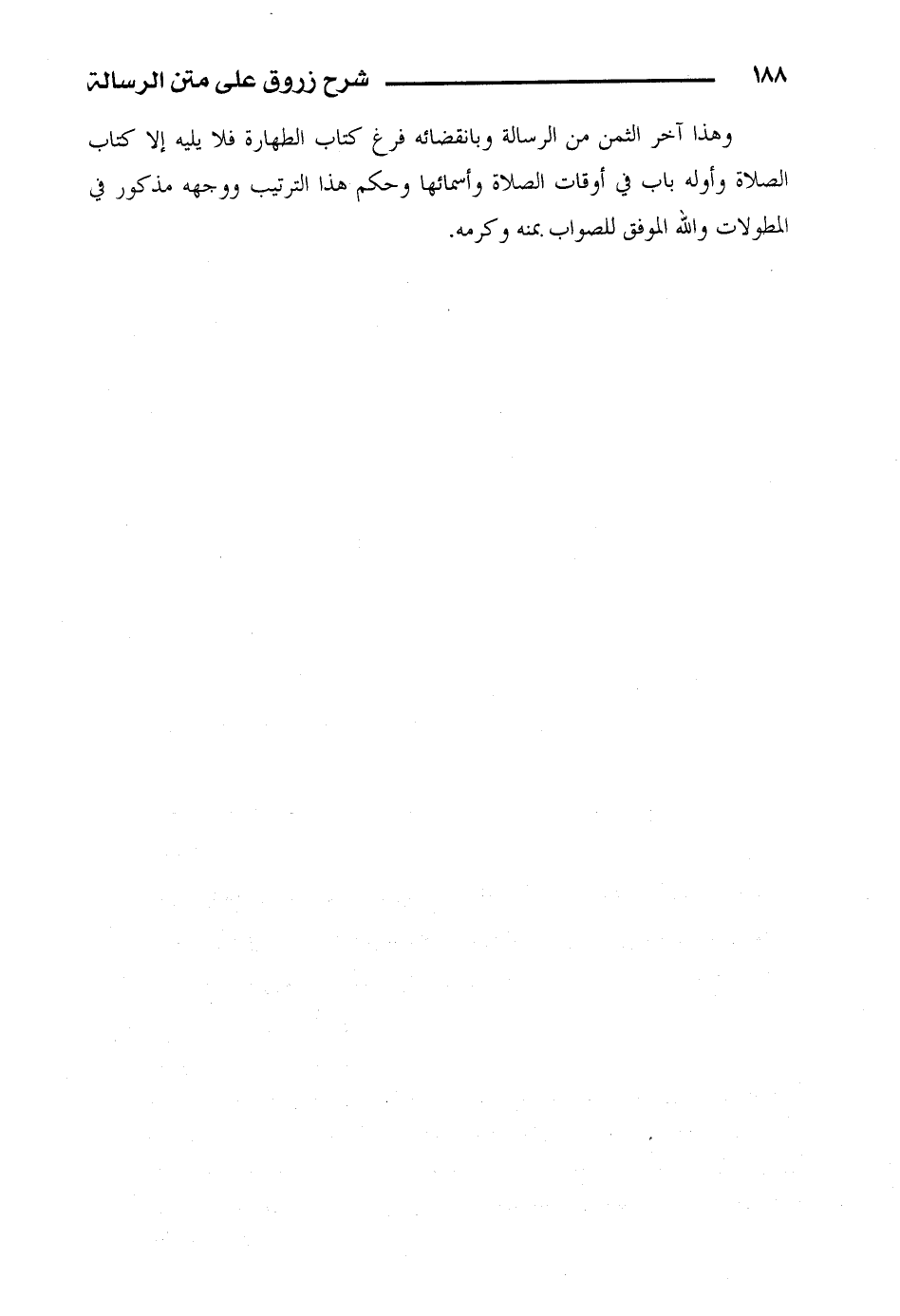وهذا آخر الثمن من الرسالة وبانقضائه فرغ كتاب الطهارة فلا يليه إلا كتاب الصلاة وأوله باب في أوقات الصلاة وأسمائها وحكم هذا الترتيب ووجهه مذكور في المطولات والله الموفق للصواب بمنه وكرمه.