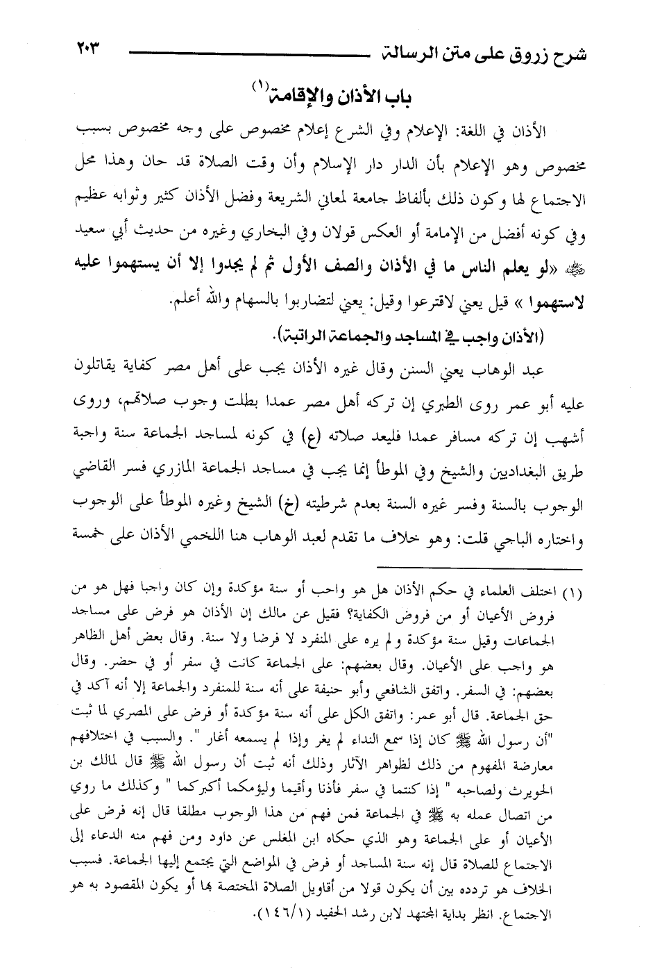 عبد الوهاب يعني السنن وقال غيره الأذان يجب على أهل مصر كفاية يقاتلون عليه أبو عمر روى الطبري إن تركه أهل مصر عمدا بطلت وجوب صلاتهم، وروى أشهب إن تركه مسافر عمدا فليعد صلاته (ع) في كونه لمساجد الجماعة سنة واجبة طريق البغداديين والشيخ وفي الموطأ إنما يجب في مساجد الجماعة المازري فسر القاضي الوجوب بالسنة وفسر غيره السنة بعدم شرطيته (خ) الشيخ وغيره الموطأ على الوجوب واختاره الباجي قلت: وهو خلاف ما تقدم لعبد الوهاب هنا اللخمي الأذان على خمسة