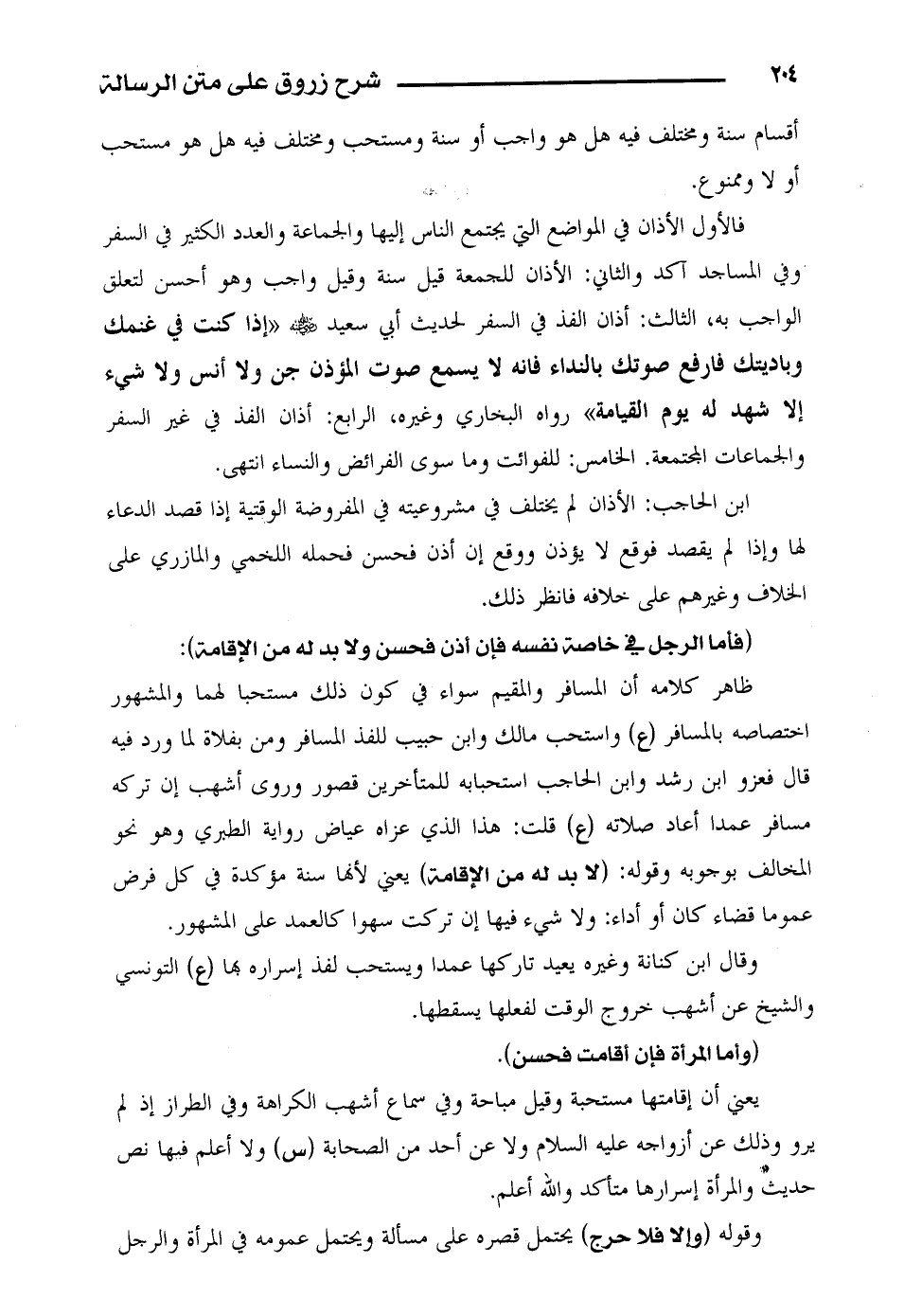 فالأول الأذان في المواضع التي يجتمع الناس إليها والجماعة والعدد الكثير في السفر وفي المساجد أكد والثاني: الأذان للجمعة قيل سنة وقيل واجب وهو أحسن لتعلق الواجب به، الثالث: أذان الفذ في السفر لحديث أبي سعيد رضي الله عنه «إذا كنت في غنمك وباديتك فارفع صوتك بالنداء فإنه لا يسمع صوت المؤذن جن ولا أنس ولا شيء إلا شهد له يوم القيامة» رواه البخاري وغيره، الرابع: أذان الفذ في غير السفر والجماعات المجتمعة. الخامس: للفوائت وما سوى الفرائض والنساء انتهى.