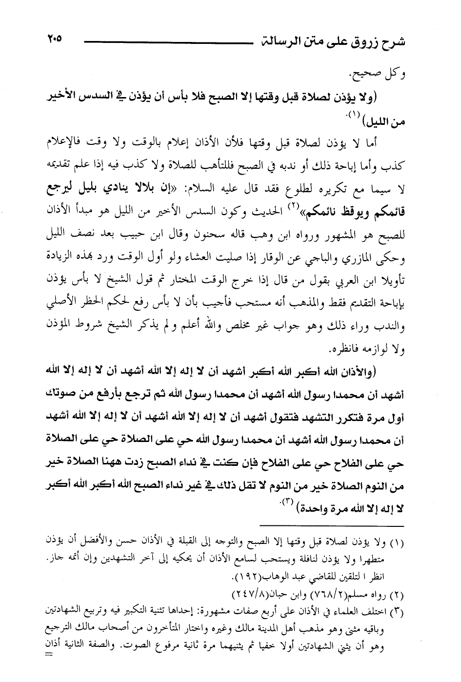 (والأذان الله أكبر الله أكبر أشهد أن لا إله إلا الله أشهد أن لا إله إلا الله اشهد أن محمداً رسول الله اشهد أن محمداً رسول الله ثم ترجع بأرفع من صوتك أول مرة فتكرر التشهد فتقول أشهد أن لا إله إلا الله اشهد أن محمداً رسول الله اشهد أن محمداً رسول الله حي على الصلاة حي على الصلاة حي على الفلاح حي على الفلاح فإن كنت في نداء الصبح زدت ههنا الصلاة خير من النوم الصلاة خير من النوم لا تقل ذلك في غير نداء الصبح الله أكبر الله أكبر لا إله إلا الله مرة واحدة).