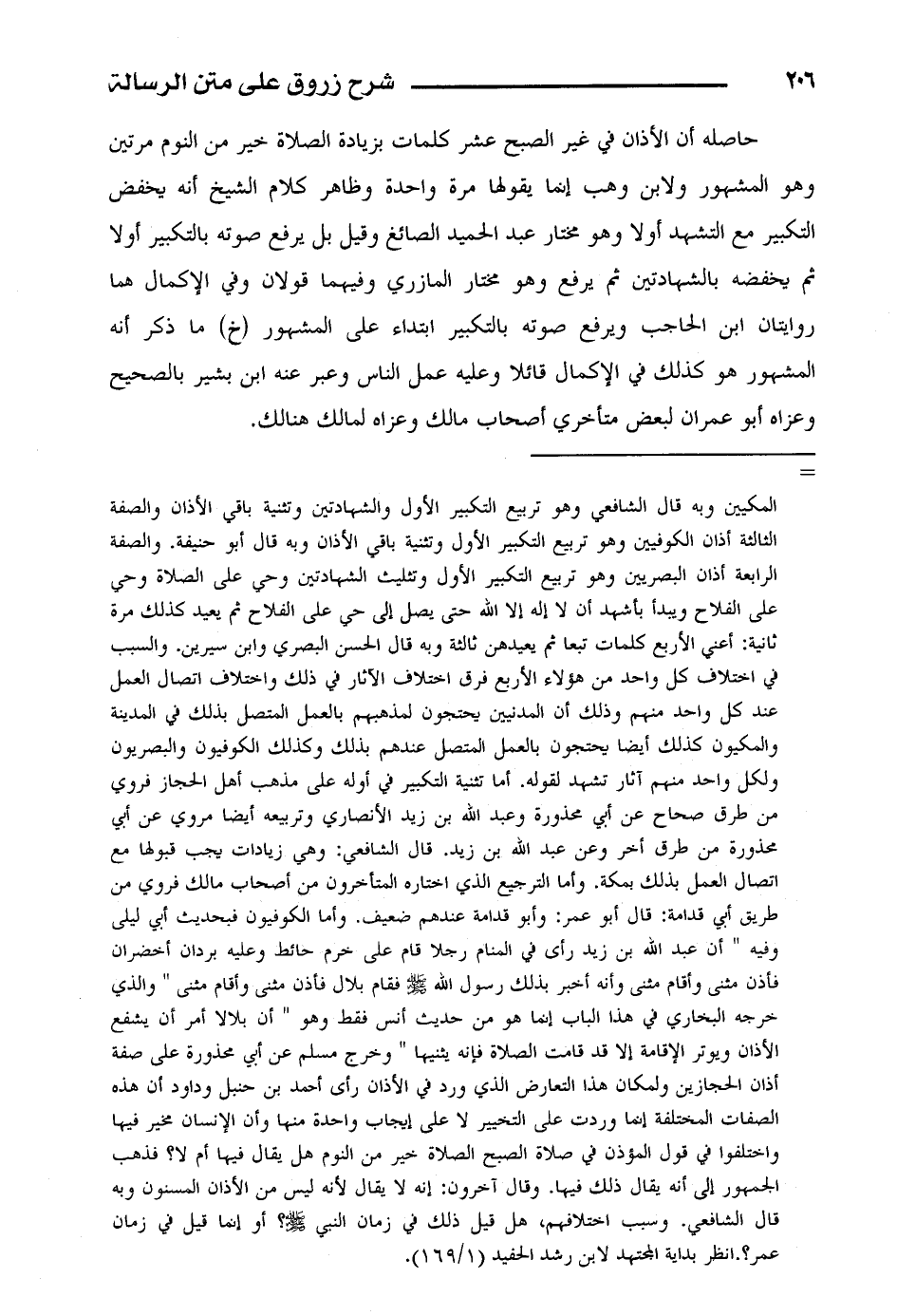 حاصله أن الأذان في غير الصبح عشر كلمات بزيادة الصلاة خير من النوم وهو المشهور ولابن وهب إنما يقولها مرة واحدة وظاهر كلام الشيخ أنه يخفض التكبير مع التشهد أولا وهو مختار عبد الحميد الصائغ وقيل بل يرفع صوته بالتكبير أولاً ثم يخفضه بالشهادتين ثم يرفع وهو مختار المازري وفيهما قولان وفي الإكمال هما روايتان ابن الحاجب ويرفع صوته بالتكبير ابتداء على المشهور (خ) ما ذكر أنه المشهور هو كذلك في الإكمال قائلا وعليه عمل الناس وعبر عنه ابن بشير بالصحيح وعزاه أبو عمران لبعض متأخري أصحاب مالك وعزاه لمالك هنالك.