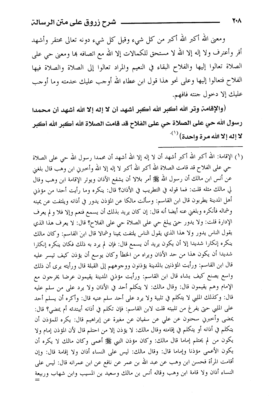 (والإقامة وتر الله أكبر الله أكبر أشهد أن لا إله إلا الله اشهد أن محمداً رسول الله حي على الصلاة حي على الصلاة حي على الفلاح قد قامت الصلاة قد قامت الصلاة الله أكبر الله أكبر لا إله إلا الله مرة واحدة).