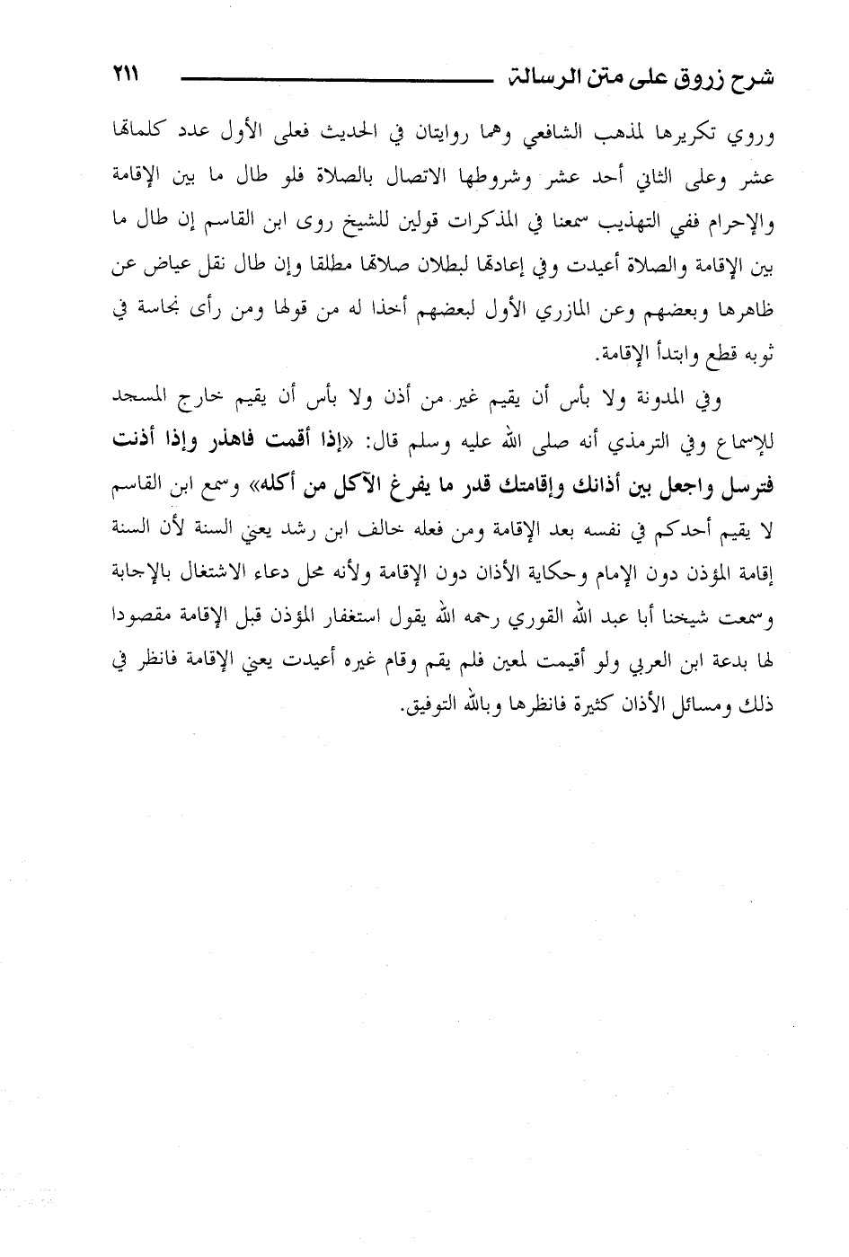 وروي تكريرها لمذهب الشافعي وهما روايتان في الحديث فعلى الأول عدد كلماتها عشر وعلى الثاني أحد عشر وشروطها الاتصال بالصلاة فلو طال ما بين الإقامة والإحرام في التهذيب سمعنا في المذكرات قولين للشيخ روى ابن القاسم إن طال ما بين الإقامة والصلاة أعيدت وفي إعادتها لبطلان صلاتها مطلقا وإن طال نقل عياض عن ظاهرها وبعضهم وعن المازري الأول لبعضهم أخذا له من قولها ومن رأى نجاسة في ثوبه فقطع وابتدأ الإقامة.