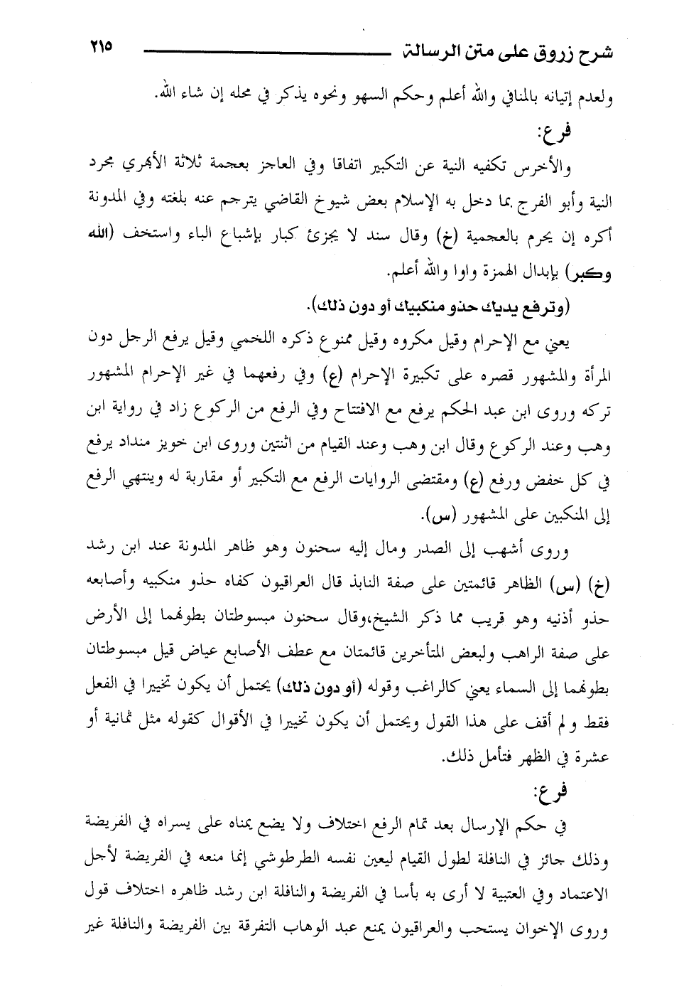 يعني مع الإحرام وقيل مكروه وقيل ممنوع ذكره اللخمي وقيل يرفع الرجل دون المرأة والمشهور فصره على تكبيرة الإحرام (ع) وفي رفعهما في غير الإحرام المشهور تركه وروى ابن عبد الحكم يرفع مع الافتتاح وفي الرفع من الركوع زاد في رواية ابن وهب وعند الركوع وقال ابن وهب وعند القيام من اثنتين وروى ابن خويز منداد يرفع في كل خفض ورفع (ع) ومقتضى الروايات الرفع مع التكبير أو مقاربة له وينتهي الرفع إلى المنكبين على المشهور (س).