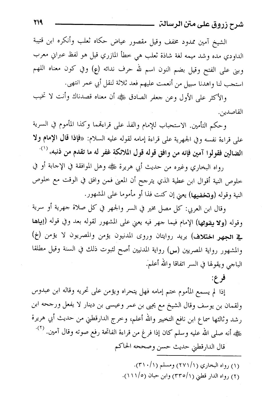 الشيخ آمين ممدود مخفف وقيل مقصور عياض حكاه ثعلب وأنكره ابن قتيبة الداودي مده وشد ميمه لغة شاذة ثعلب هي خطأ المازري قيل هو لفظ عبراني معرب وبنى على الفتح وقيل بضم النون اسم لله حرف ندائه (ع) وفي كون معناه اللهم استجب لنا واهدنا سبيل من أنعمت عليهم فعد ثلاثة لنقل أبي عمر انتهى.