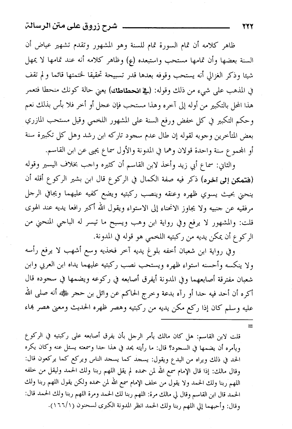 والثاني: سماع أبي زيد وأخذ لابن القاسم أن كثيره واجب بخلاف اليسير وقوله (فتمكن إلى آخره) ذكر فيه صفة الكمال في الركوع قال ابن بشير الركوع أقله أن ينحني بحيث يسوي ظهره وعنقه وينصب ركبتيه ويضع كفيه عليهما ويجافي الرجل مرفقيه عن جنبيه ولا يجاوز الانحناء إلى الاستواء ويقول الله أكبر رافعا يديه عند الهوى قلت: والمشهور لا يرفع وفي رواية ابن وهب ويسبح ما تيسر له الباجي المنحني من الركوع أن يمكن يديه من ركبتيه اللخمي هو قوله في المدونة.