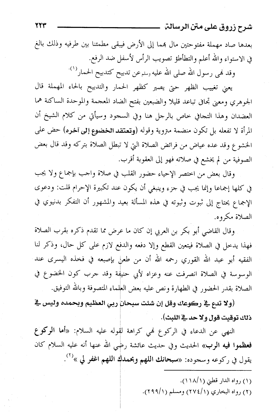 وقال القاضي أبو بكر بن العربي إن كان ما عرض مما تقدم ذكره بقرب الصلاة فهذا يدخل في الصلاة فيتعين القطع وإلا دفعه والدفع لازم على كل حال، وذكر لنا الفقيه أبو عبد الله القوري رحمه الله أن من طعن بإصبعه في فخذه اليسرى عند الوسوسة في الصلاة انصرفت عنه وعزاه لأبي حنيفة وقد جرب كون الخضوع في الصلاة بقدر الحضور في الطهارة ونص عليه بعض العلماء المتصوفة وبالله التوفيق.