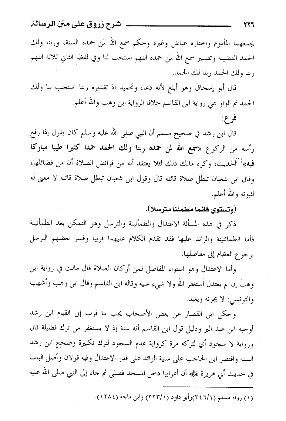 قال ابن رشد في صحيح مسلم أن النبي صلى الله عليه وسلم كان يقول إذا رفع رأسه من الركوع «سمع الله لمن حمده ربنا ولك الحمد حمدا كثيراً طيباً مباركاً فيه» الحديث، وكره مالك ذلك لئلا يعتقد أنه من فرائض الصلاة أن من فضائلها، وقال ابن شعبان تبطل صلاة قائله قال وقول ابن شعبان تبطل صلاة قائله لا معنى له لثبوته والله أعلم.