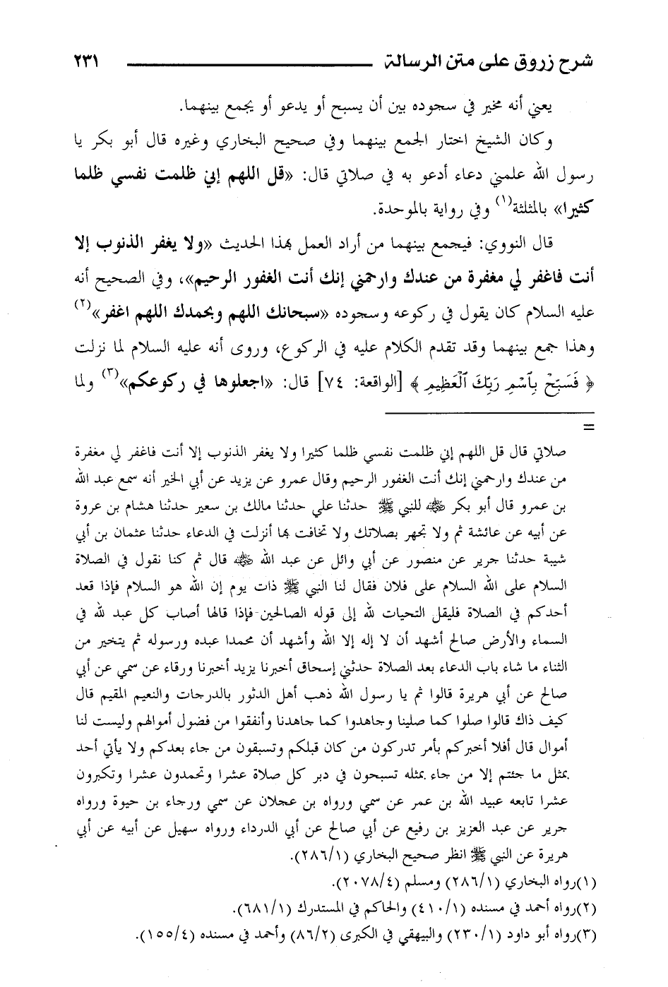 قال النووي: فيجمع بينهما من أراد العمل بهذا الحديث «ولا يغفر الذنوب إلا أنت فاغفر لي مغفرة من عندك وارحمني إنك أنت الغفور الرحيم». وفي الصحيح أنه عليه السلام كان يقول في ركوعه وسجوده «سبحانك اللهم وبحمدك اللهم اغفر» وهذا جمع بينهما وقد تقدم الكلام عليه في الركوع، وروى أنه عليه السلام لما نزلت {فَسَبِّحْ بِاسْمِ رَبِّكَ العَظِيمِ} [الواقعة: 74] قال: «اجعلوها في ركوعكم» ولما