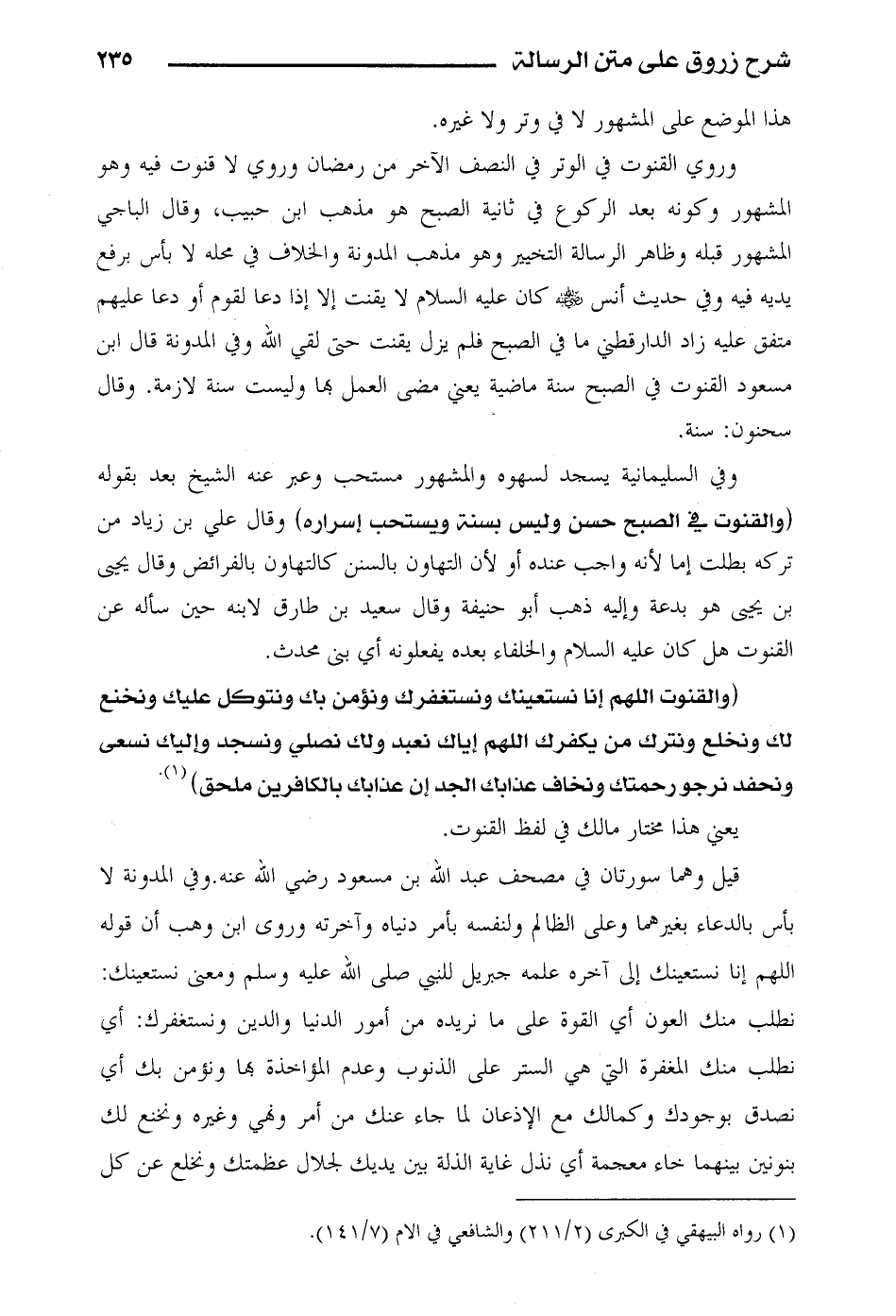 (والقنوت اللهم إنا نستعينك ونستغفرك ونؤمن بك ونتوكل عليك ونخنع لك ونخلع ونترك من يكفرك اللهم إياك نعبد ولك نصلي ونسجد وإليك نسعى ونحفد نرجو رحمتك ونخاف عذابك الجد إن عذابك بالكافرين ملحق).