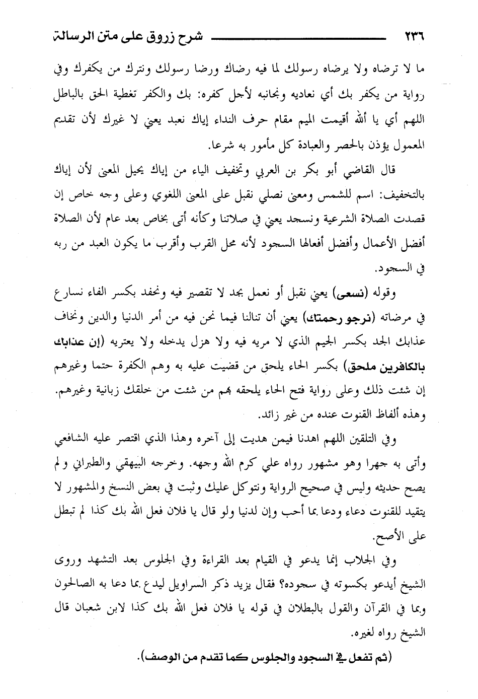 وفي الجلاب إنما يدعو في القيام بعد القراءة وفي الجلوس بعد التشهد وروى الشيخ أيدعو بكسوته في سجوده؟ فقال يزيد ذكر السراويل ليدع بما دعا به الصالحون وبما في القرآن والقول بالبطلان في قوله يا فلان فعل الله بك كذا لابن شعبان قال الشيخ رواه لغيره.