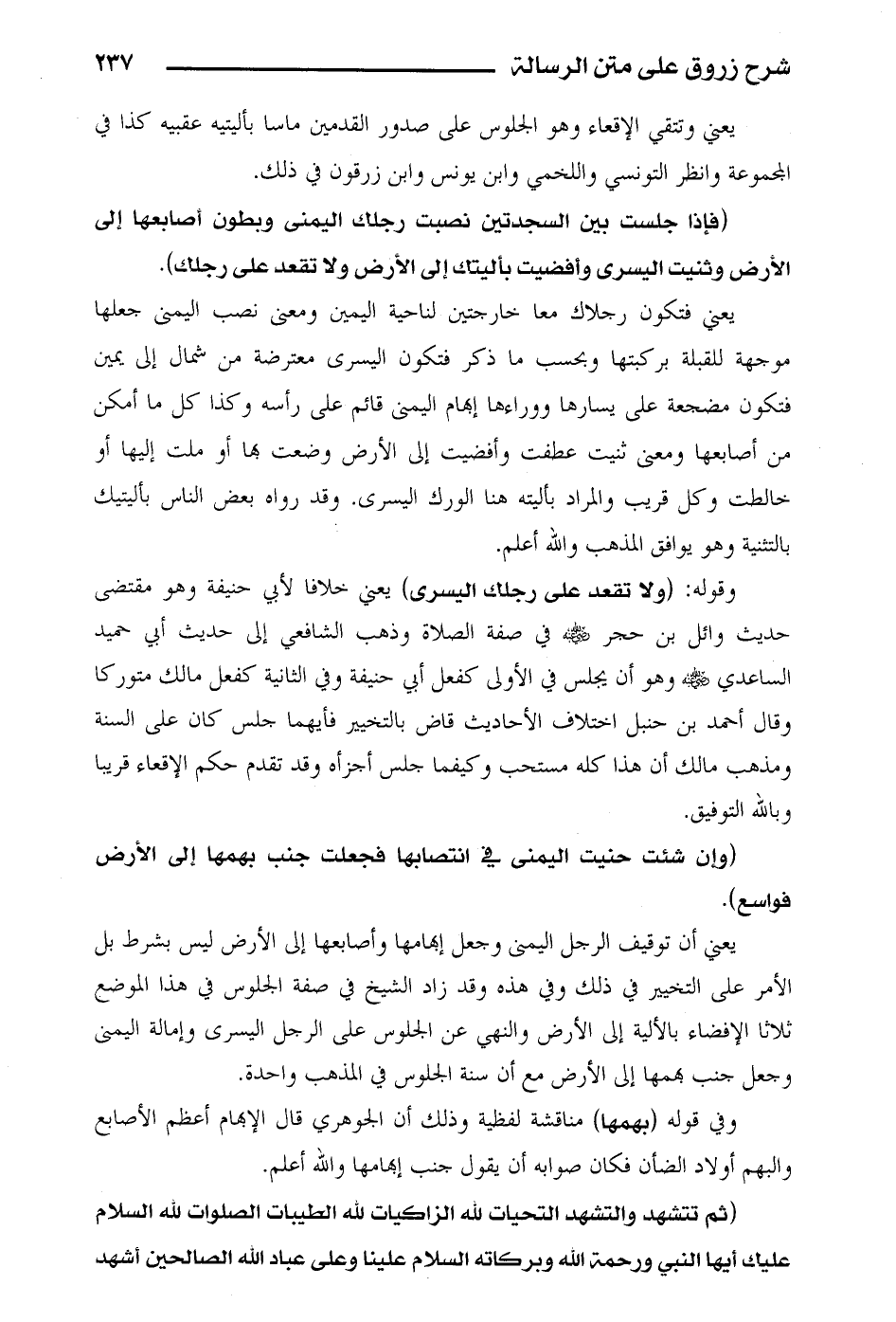 وقوله: (ولا تقعد على رجلك اليسرى) يعني خلافا لأبي حنيفة وهو مقتضى حديث وائل بن حجر رضي الله عنه في صفة الصلاة وذهب الشافعي إلى حديث أبي حميد الساعدي رضي الله عنه وهو أن يجلس في الأولى كفعل أبي حنيفة وفي الثانية كفعل مالك متوركا وقال أحمد بن حنبل اختلاف الأحاديث قاض بالتخيير فأيهما جلس كان على السنة ومذهب مالك أن هذا كله مستحب وكيفما جلس أجزأه وقد تقدم حكم الإقعاء قريبا وبالله التوفيق.