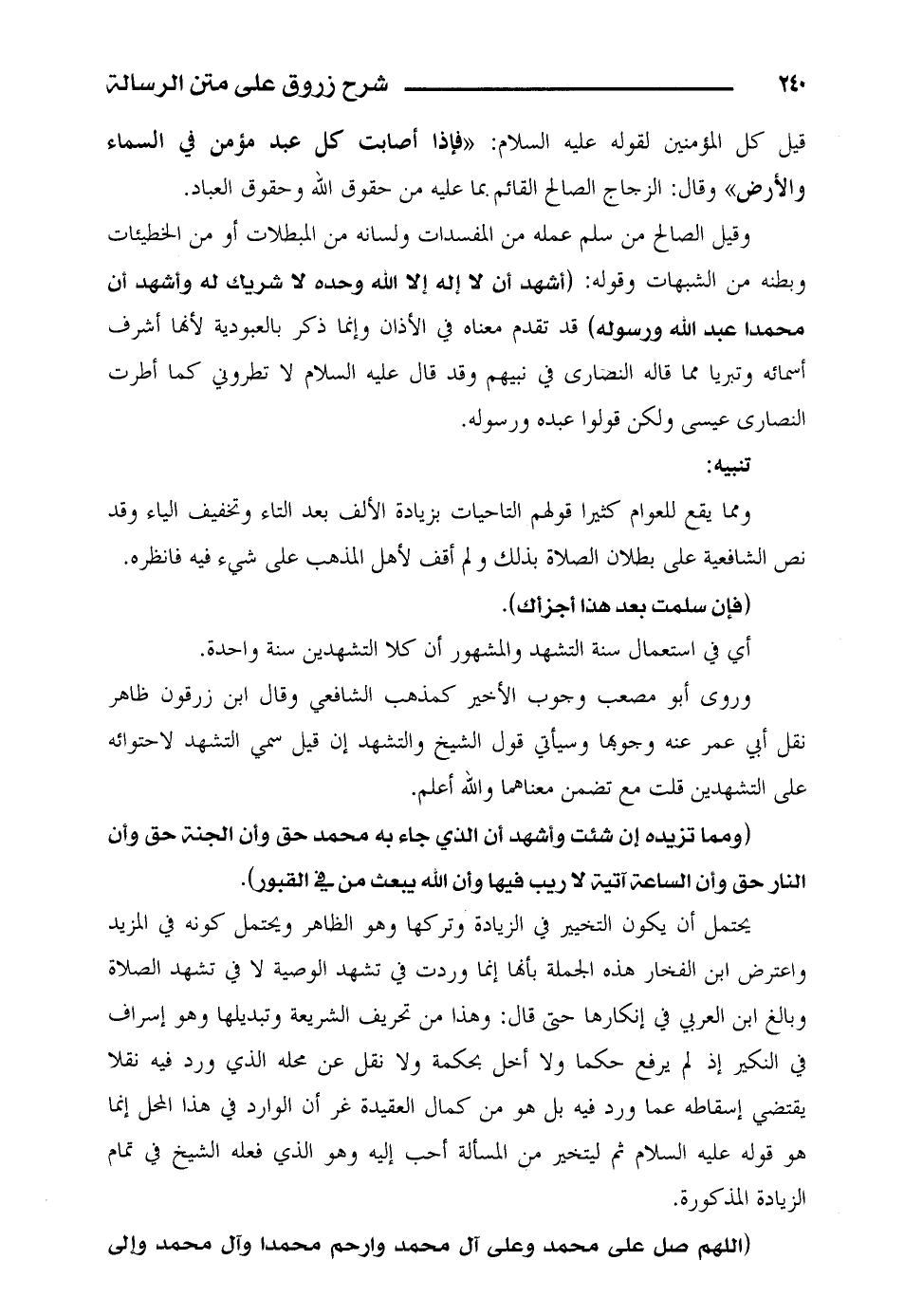 يحتمل أن يكون التخيير في الزيادة وتركها وهو الظاهر ويحتمل كونه في المزيد واعترض ابن الفخار هذه الجملة بأنها إنما وردت في تشهد الوصية لا في تشهد الصلاة وبالغ ابن العربي في إنكارها حتى قال: وهذا من تحريف الشريعة وتبديلها وهو إسراف في النكير إذ لم يرفع حكما ولا أخل بحكمة ولا نقل عن محله الذي ورد فيه نقلا يقتضي إسقاطه عما ورد فيه بل هو من كمال العقيدة غر أن الوارد في هذا المحل إنما هو قوله عليه السلام ثم ليتخير من المسألة أحب إليه وهو الذي فعله الشيخ في تمام الزيادة المذكورة.