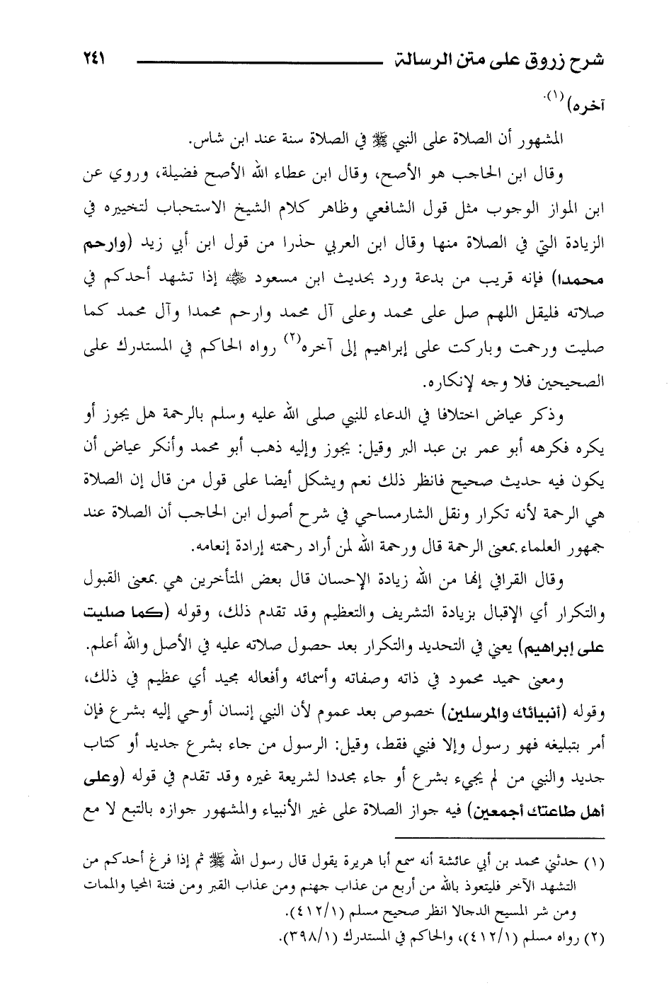 وقال ابن الحاجب هو الأصح، وقال ابن عطاء الله الأصح فضيلة، وروي عن ابن المواز الوجوب مثل قول الشافعي وظاهر كلام الشيخ والاستحباب لتخييره في الزيادة التي في الصلاة منها وقال ابن العربي حذرا من قول ابن أبي زيد (وارحم محمدا) فإنه قريب من بدعة ورد بحديث ابن مسعود رضي الله عنه إذا تشهد أحدكم في صلاته فليقل اللهم صل على محمد وعلى آل محمد وارحم محمدا وآل محمد كما صليت ورحمت وباركت على إبراهيم إلى آخره. رواه الحاكم في المستدرك على الصحيحين فلا وجه لإنكاره.