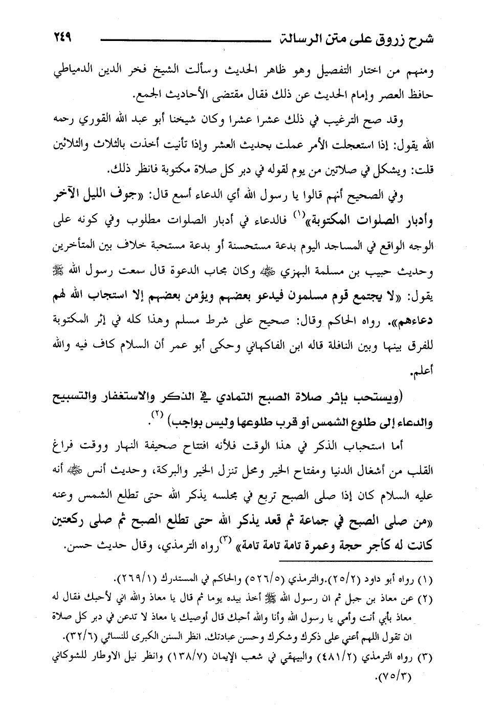 وفي الصحيح أنهم قالوا يا رسول الله أي الدعاء أسمع قال: «جوف الليل الآخر وأدبار الصلوات المكتوبة» فالدعاء في أدبار الصلوات مطلوب وفي كونه على الوجه الواقع في المساجد اليوم بدعة مستحسنة أو بدعة مستحبة خلاف بين المتأخرين وحديث حبيب بن مسلمة البهزي رضي الله عنه وكان مجاب الدعوة قال سمعت رسول الله صلى الله عليه وسلم يقول: «لا يجتمع قوم مسلمون فيدعو بعضهم ويؤمن بعضهم إلا استجاب الله لهم دعاءهم». رواه الحاكم وقال: صحيح على شرط مسلم وهذا كله في إثر المكتوبة للفرق بينها وبين النافلة قاله ابن الفاكهاني وحكى أبو عمر أن السلام كاف فيه والله أعلم.
