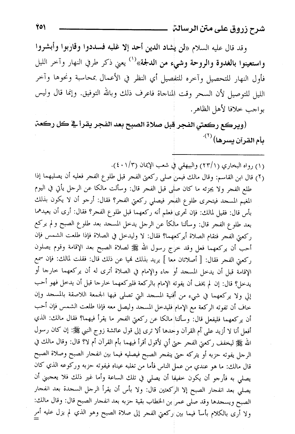 وقد قال عليه السلام: «لن يشاد الدين أحد إلا غلبه فسددوا وقاربوا وأبشروا واستعينوا بالغدوة والروحة وشيء من الدلجة» يعني ذكر طرفي النهار وآخر الليل فأول النهار للتحصيل وآخره للتفصيل أي النظر في الأعمال بمحاسبة ونحوها وآخر الليل للتوصيل لأن السحر وقت المناجاة فاعرف ذلك وبالله التوفيق. وإنما قال وليس بواجب خلافاً لأهل الظاهر.
