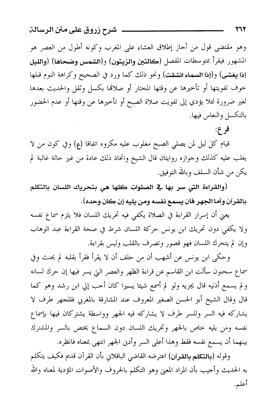 وحكى ابن يونس عن أشهب أن من حلف أن لا يقرأ فقرأ بقلبه لم يحنث وفي سماع سحنون سألت ابن القاسم عن قراءة الظهر والعصر التي يسر فيها إن حرك لسانه ولم يسمع أذنيه قال يجزيه ولو لم أسمع شيئاً يسيراً كان أحب إلي ابن رشد وهو كما قال وقال الشيخ أبو الحسن الصغير المعروف عند المشارقة بالمغربي فللجهر طرف لا يشاركه في السر وللسر طرف لا يشاركه فيه الجهر وواسطة يشتركان فيها بإسماع نفسه ومن يليه خاص بالجهر وتحريك اللسان دون السماع يختص بالسر والمشترك بينهما أن يسمع نفسه فقط وهذا أعلى السر وأدنى الجهر انتهى بمعناه فانظره.