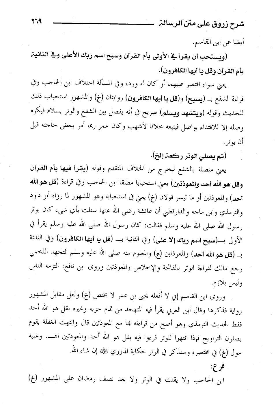 وروى ابن القاسم إني لا أفعله يحيى بن عمر لا يختص (خ) ولعل مقابل المشهور رواية فذكرها وقال ابن العربي يقرأ فيه المتهجد من تمام حزبه وغيره بقل هو الله أحد فقط لحديث الترمذي وهو أصح من قراءته بها مع المعوذتين قال وانتهت الغفلة بقوم يصلون التراويح فإذا انتهوا للوتر قرءوا فيه بقل هو الله أحد والمعوذتين اهـ.