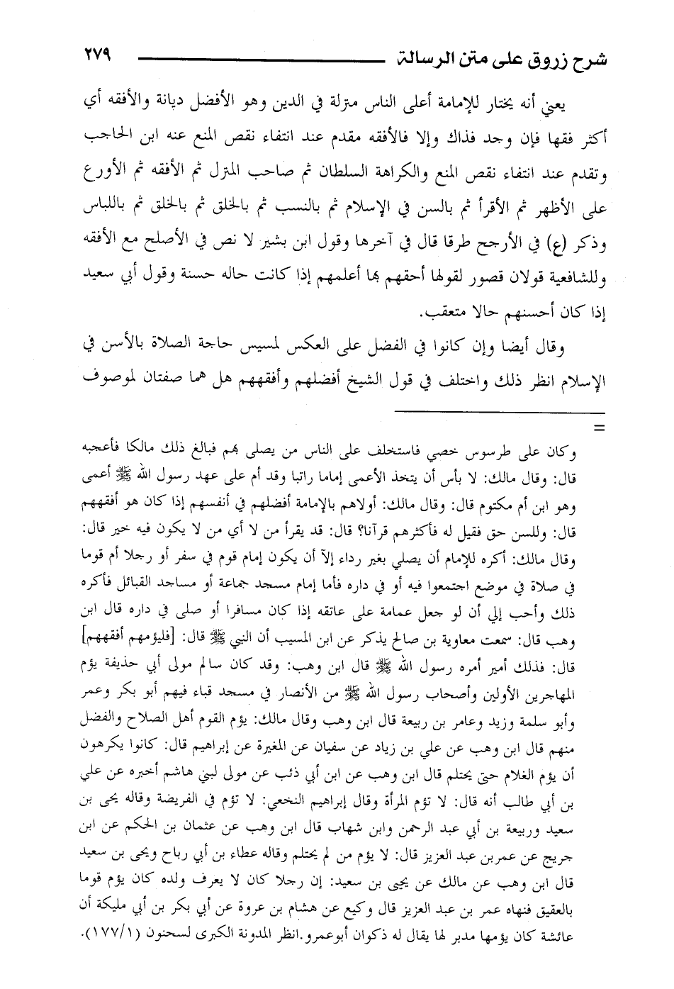 وقال أيضاً وإن كانوا في الفضل على العكس لمسيس حاجة الصلاة بالأسن في الإسلام انظر ذلك واختلف في قول الشيخ أفضلهم وأفقههم هل هما صفتان لموصوف