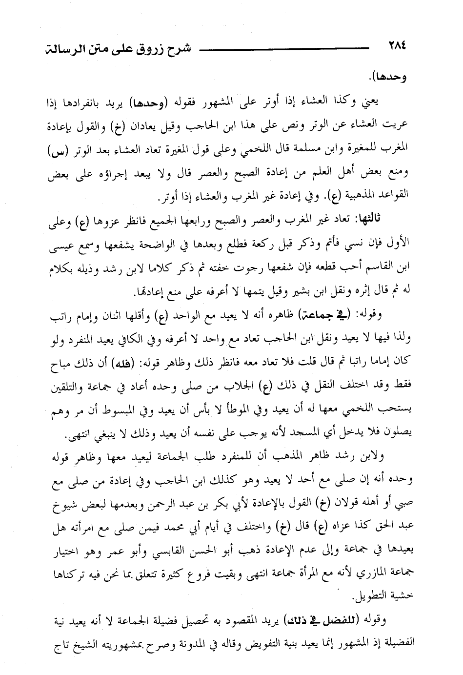 ثالثها: تعاد غير المغرب والعصر والصبح ورابعها الجميع فانظر عزوها (ع) وعلى الأول فإنه نسي فأتم وذكر قبل ركعة فطلع وبعدها في الواضحة يشفعها وسمع عيسى ابن القاسم أحب قطعه فإن شفعها رجوت خفته ثم ذكر كلاما لابن رشد وذيله بكلام لخ ثم قال إثره ونقل ابن بشير وقيل يتمها لا أعرفه على منع إعادتها.