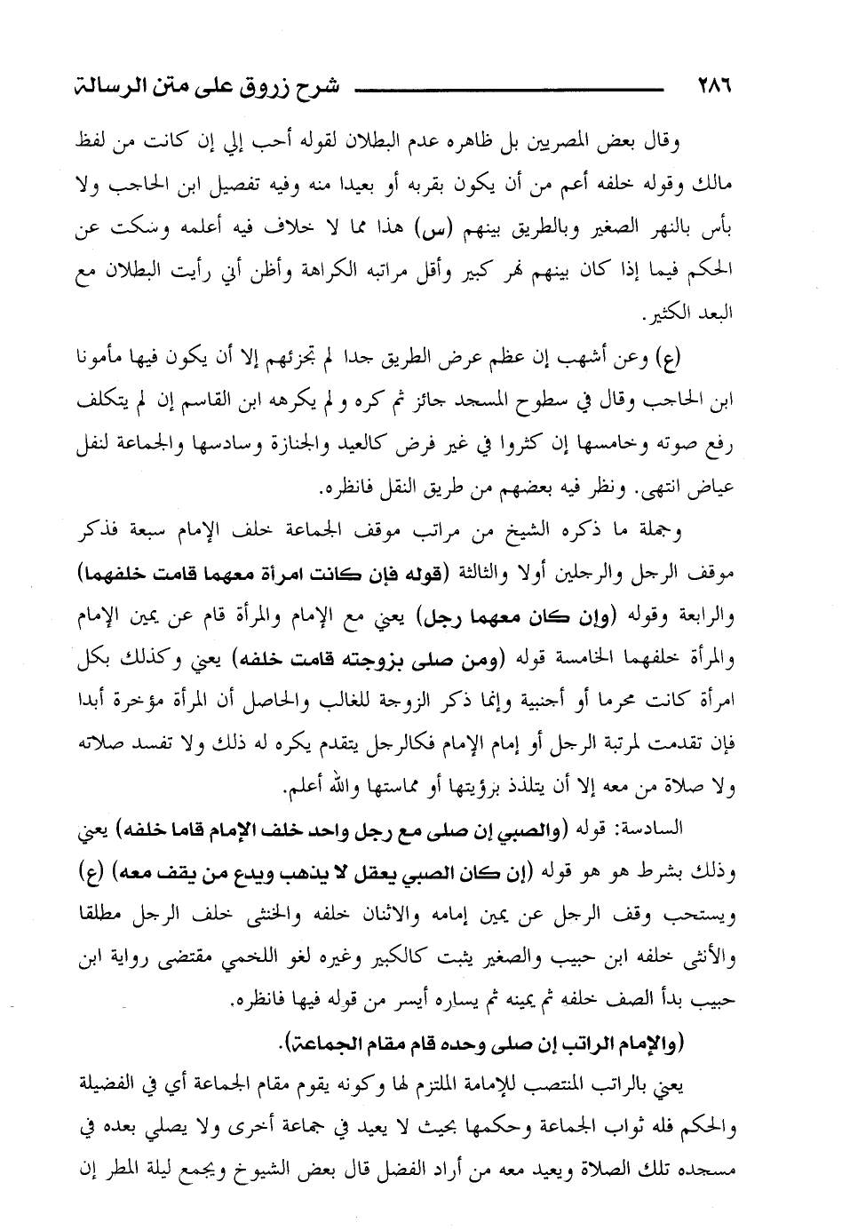 وجملة ما ذكره الشيخ من مراتب موقف الجماعة خلف الإمام سبعة فذكر موقف الرجل والرجلين أولاً والثالثة (قوله فإن كانت امرأة معهما قامت خلفهما) والرابعة وقوله (وإن كان معها رجل) يعني مع الإمام والمرأة قام عن يمين الإمام والمرأة خلفهما الخامسة قوله (ومن صلى بزوجته قامت خلفه) يعني وكذلك بكل امرأة كانت محرما أو أجنبية وإنما ذكر الزوجة للغالب والحاصل أن المرأة مؤخرة أبدا فإن تقدمت لمرتبة الرجل أو إمام الإمام فكالرجل يتقدم يكره له ذلك ولا تفسد صلاته ولا صلاة من معه إلا أن يتلذذ برؤيتها أو مماستها والله أعلم.