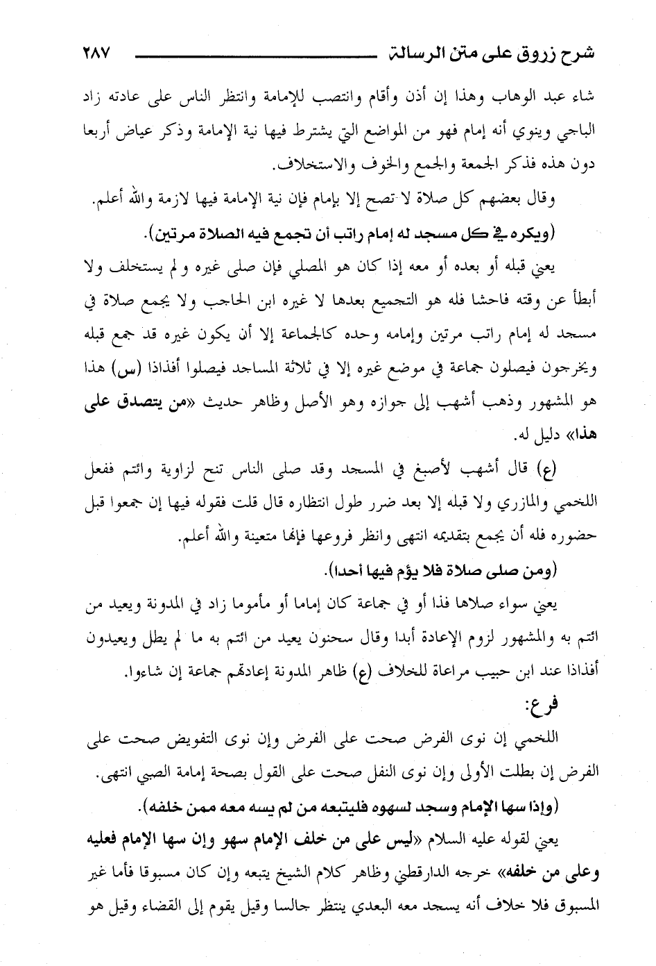 (ع) قال أشهب لأصبغ في المسجد وقد صلى الناس تنح لزاوية وائتم ففعل اللخمي والمازري ولا قبله إلا بعد ضرر طول انتظاره قال قلت فقوله فيها إن جمعوا قبل حضوره فله أن يجمع بتقديمه انتهى وانظر فروعها فإنها متعينة والله أعلم.