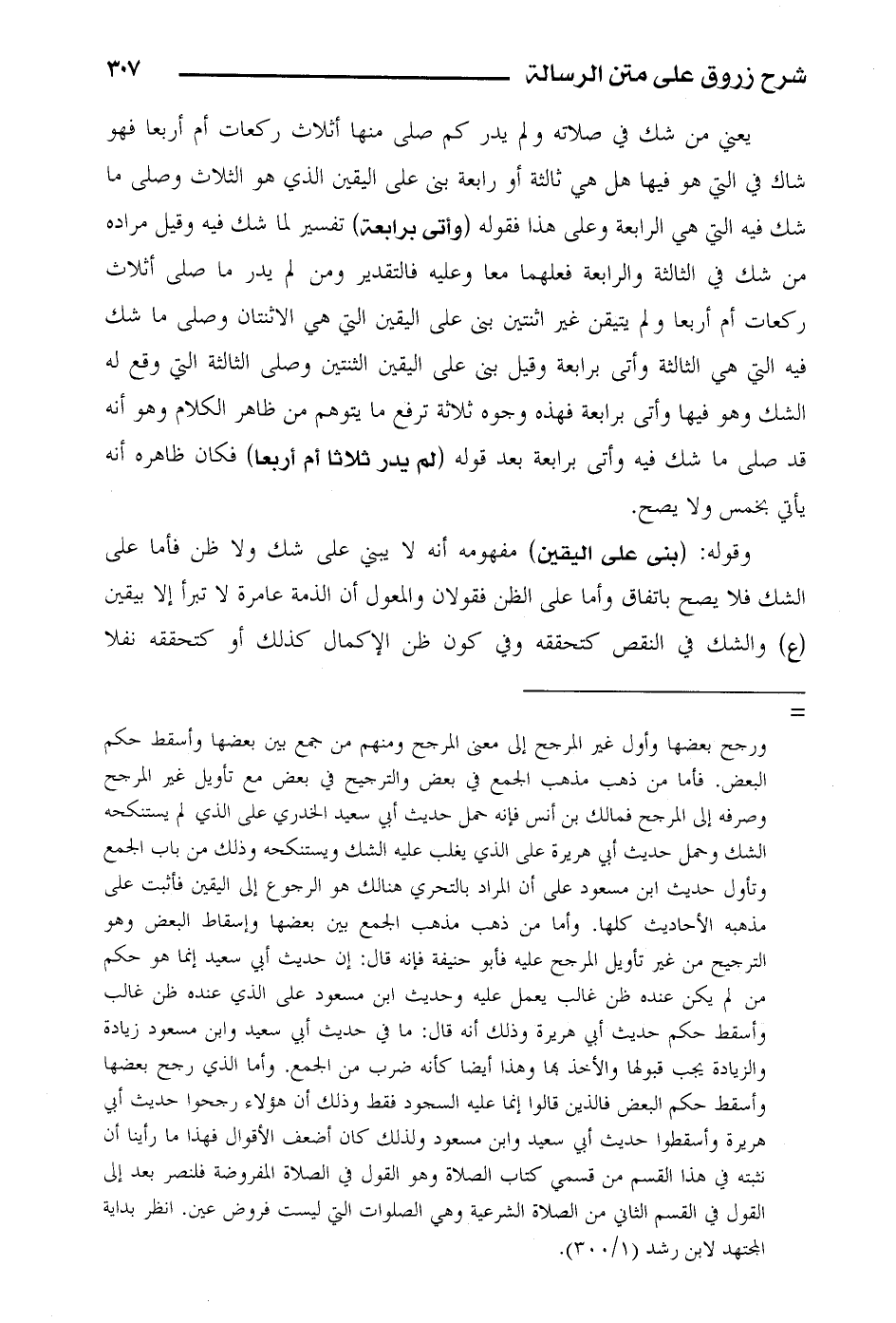 وقوله: (بنى على اليقين) مفهومه أنه لا يبني على شك ولا ظن فأما على الشك فلا يصح باتفاق وأما على الظن فقولان والمعول أن الذمة عامرة لا تبرأ ألا بيقين (ع) والشك في النقص كتحققه وفي كون ظن الإكمال كذلك أو كتحققه نفلا