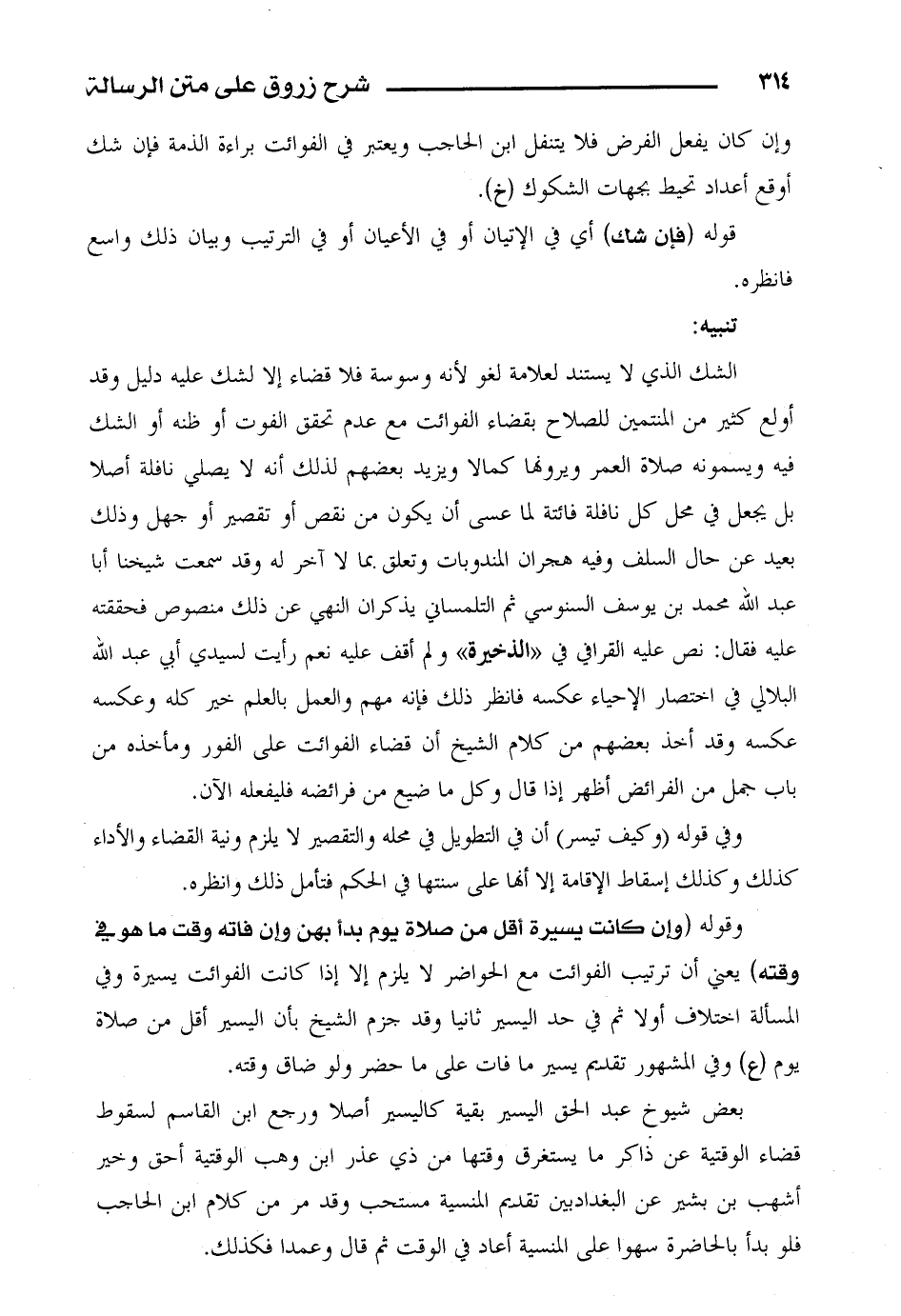 الشك الذي لا يستند لعلامة لغو لأنه وسوسة فلا قضاء إلا لشك عليه دليل وقد أولع كثير من المنتمين للصلاح بقضاء الفوائت مع عدم تحقق الفوت أو ظنه أو الشك فيه ويسمونه صلاة العمر ويرونها كمالا ويزيد بعضهم لذلك أنه لا يصلي نافلة أصلاً بل يجعل في محل كل نافلة فائتة لما عسى أن يكون من نقص أو تقصير أو جهل وذلك بعيد عن حال السلف وفيه هجران المندوبات وتعلق بما لا آخر له وقد سمعت شيخنا أبا عبد الله محمد بن يوسف السنوسي ثم التلمساني يذكران النهي عن ذلك منصوص فحققته عليه فقال: نص عليه القرافي في «الذخيرة» ولم أقف عليه نعم رأيت لسيدي أبي عبد الله البلالي في اختصار الإحياء عكسه وقد أخذ بعضهم من كلام الشيخ أن قضاء الفوائت على الفور ومأخذه من باب جمل من الفرائض أظهر إذا قال وكل ما ضيع من فرائضه فليفعله الآن.