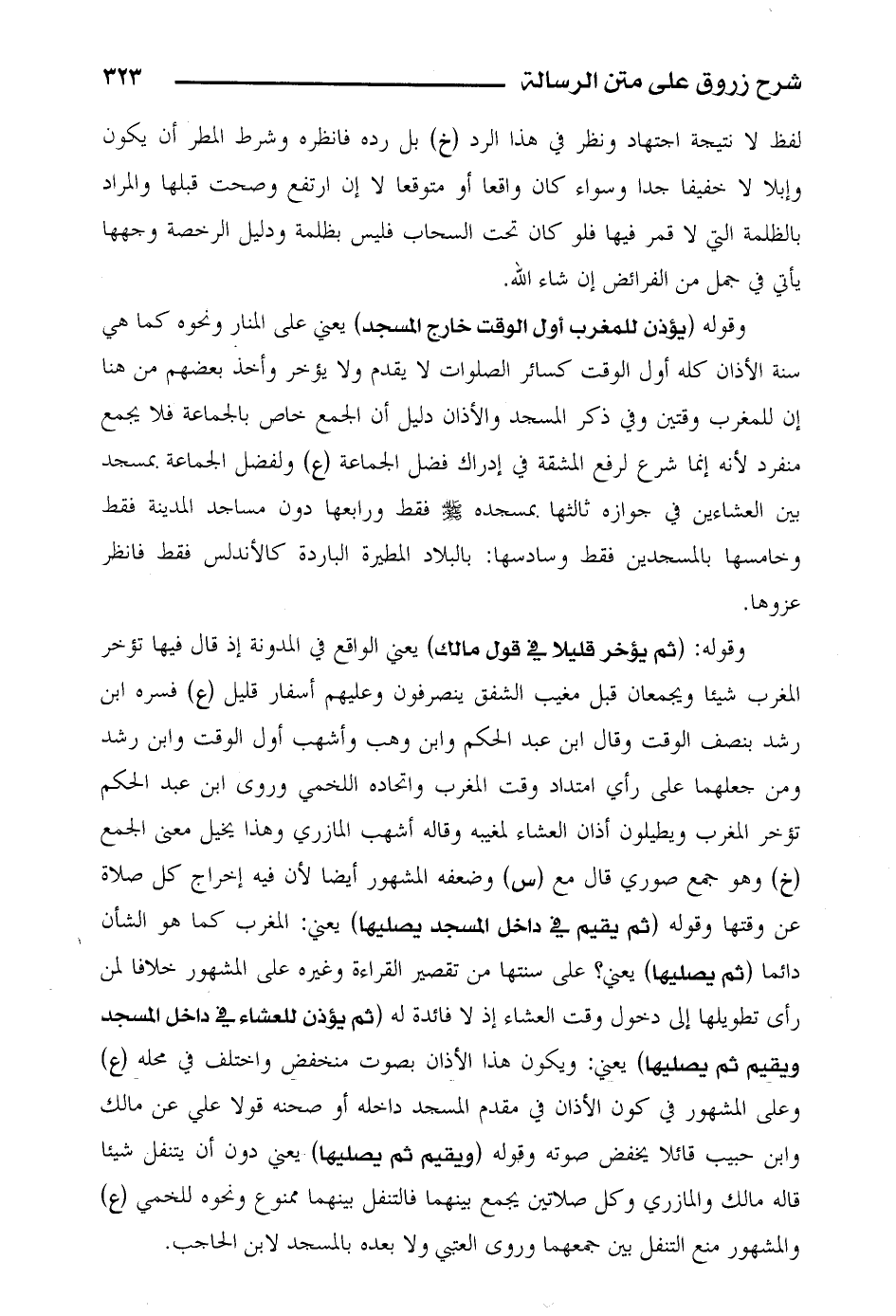وقوله (يؤذن للمغرب أول الوقت خارج المسجد) يعني على المنار ونحوه كما هي سنة الأذان كله أول الوقت كسائر الصلوات لا يقدم ولا يؤخر وأخذ بعضهم من هنا إن للمغرب وقتين وفي ذكر المسجد والأذان دليل أن الجمع خاص بالجماعة فلا يجمع منفرد لأنه إنما شرع لرفع المشقة في إدراك فضل الجماعة (ع) ولفضل الجماعة بمسجد بين العشاءين في جوازه ثالثها بمسجده صلى الله عليه وسلم فقط ورابعها دون مساجد المدينة فقط وخامسها بالمسجدين فقط وسادسها: بالبلاد المطيرة الباردة كالأندلس فقط فانظر عزوها.