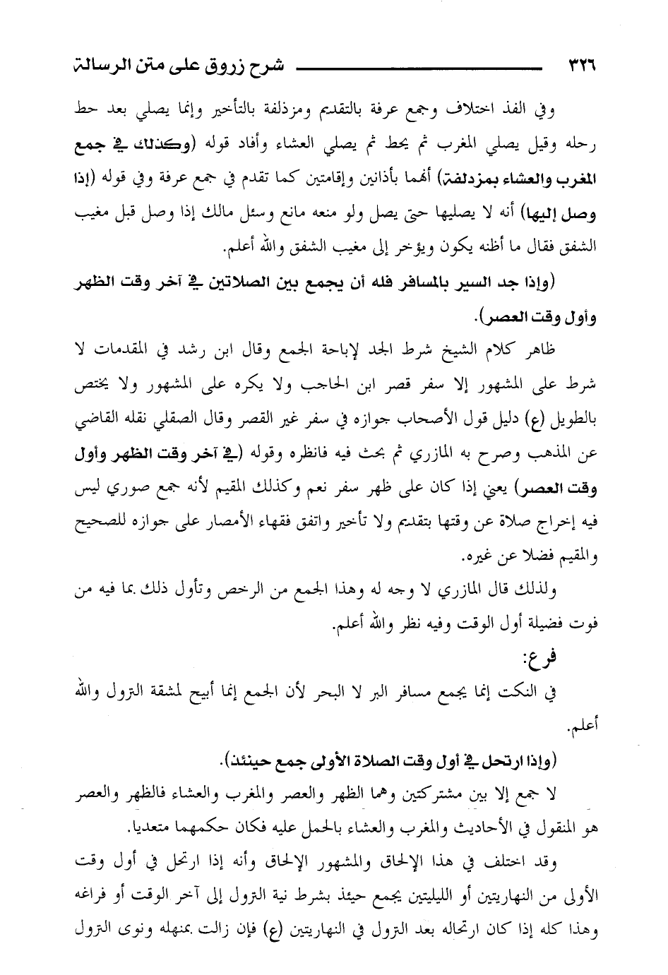 ظاهر كلام الشيخ شرط الجد لإباحة الجمع وقال ابن رشد في المقدمات لا شرط على المشهور إلا سفر قصر ابن الحاجب ولا يكره على المشهور ولا يختص بالطويل (ع) دليل قول الأصحاب جوازه في سفر غير القصر وقال الصقلي نقله القاضي عن المذهب وصرح به المازري ثم بحث فيه فانظره وقوله (في آخر وقت الظهر وأول وقت العصر) يعني إذا كان على ظهر سفر نعم وكذلك المقيم لأنه جمع صوري ليس فيه إخراج صلاة عن وقتها بتقديم ولا تأخير واتفق فقهاء الأمصار على جوازه للصحيح والمقيم فضلا عن غيره.