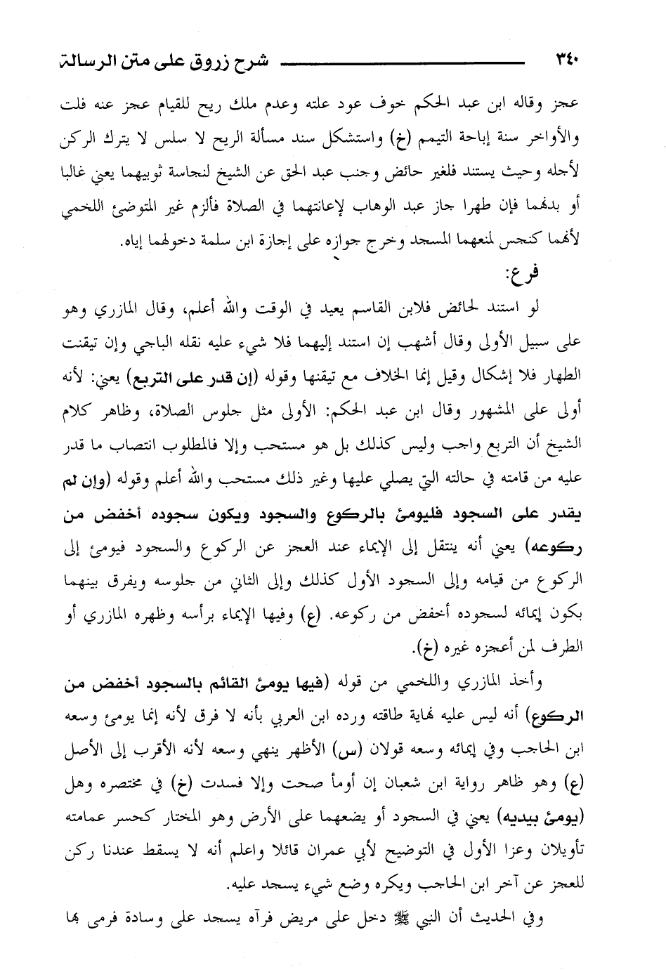 لو استند لحائض فلابن القاسم يعيد في الوقت والله أعلم، وقال المازري وهو على سبيل الأولى وقال أشهب إن استند إليهما فلا شيء عليه نقله الباجي وإن تيقنت الطهار فلا إشكال وقيل إنما الخلاف مع تيقنها وقوله (إن قدر على التربع) يعني: لأنه أولى على المشهور وقال ابن عبد الحكم: الأولى مثل جلوس الصلاة، وظاهر كلام الشيخ أن التربع واجب وليس كذلك بل هو مستحب وإلا فالمطلوب انتصاب ما قدر عليه من قامته في حالته التي يصلي عليها وغير ذلك مستحب والله أعلم وقوله (وإن لم يقدر على السجود فليومئ بالركوع والسجود ويكون سجوده أخفض من ركوعه) يعني أنه ينتقل إلى الإيماء عند العجز عن الركوع والسجود فيومئ إلى الركوع من قيامه وإلى السجود الأول كذلك وإلى الثاني من جلوسه ويفرق بينهما بكون إيمائه لسجوده أخفض من ركوعه. (ع) وفيها الإيماء برأسه وظهره المازري أو الطرف لمن أعجزه غيره (خ).