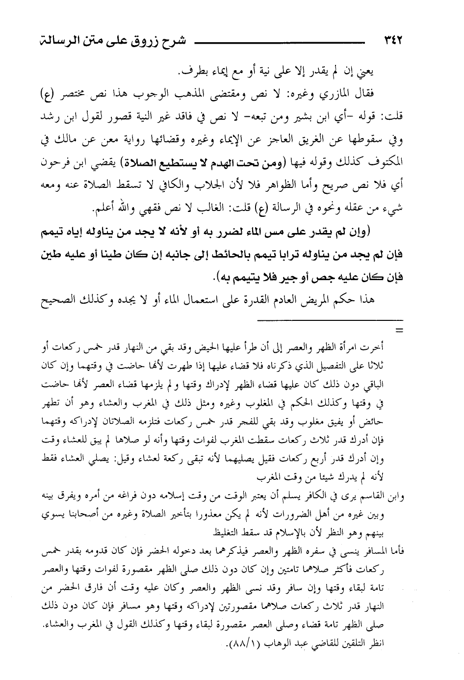 فقال المازري وغيره: لا نص ومقتضى المذهب الوجوب هذا نص مختصر (ع) قلت: قوله – أي ابن بشير ومن تبعه – لا نص في فاقد غير النية قصور لقول ابن رشد وفي سقوطها عن الغريق العاجز عن الإيماء وغيره وقضائها رواية معن عن مالك في المكتوف كذلك وقوله فيها (ومن تحت الهدم لا يستطيع الصلاة) يقضي ابن فرحون أي فلا نص صريح وأما الظواهر فلا لأن الجلاب والكافي لا تسقط الصلاة عنه ومعه شيء من عقله ونحوه في الرسالة (ع) قلت: الغالب لا نص فقهي والله أعلم.